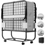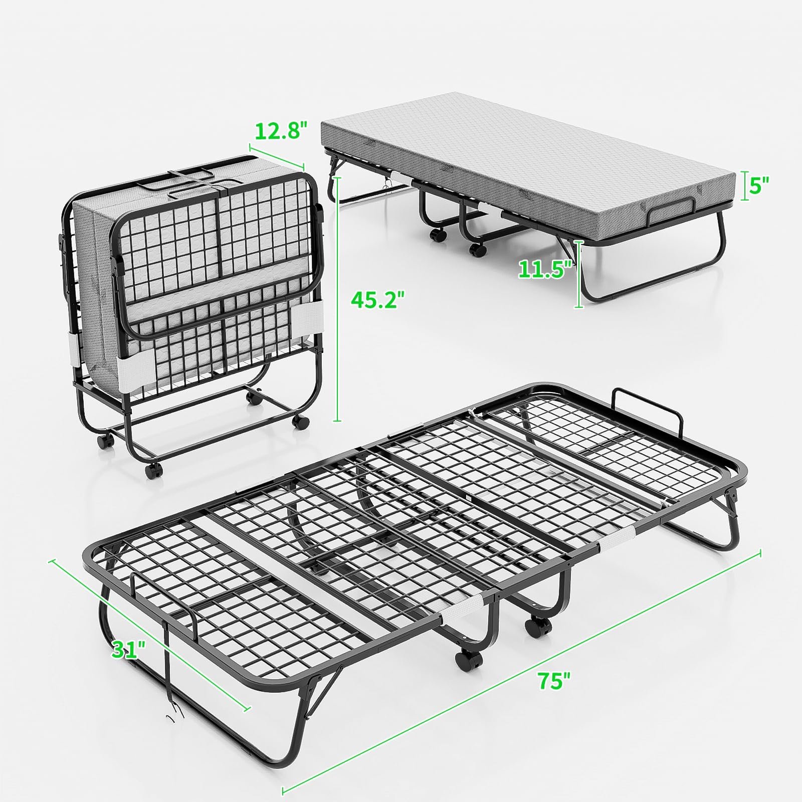 𝗦𝗽𝗮𝗰𝗲 𝗦𝗮𝘃𝗶𝗻𝗴: When not in use, the folding bed can be easily collapsed and stored away, making it a space-saving option for smaller living spaces or for those who frequently host guests. Only 12.8″ thick when it is folded up, it takes no extra room, and will be easy to tuck away somewhere out of sight. Folded Dimensions: W: 31″ L x 12.8″ D x 45.2H″ Open Dimensions: 31″ D x 11.5″ H x 75″L. The rollaway bed is perfect as a guest bed for adults and kids, an extra bed, an office nap bed, or a daybed.