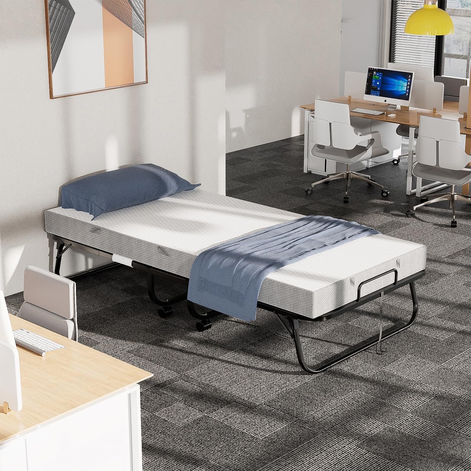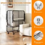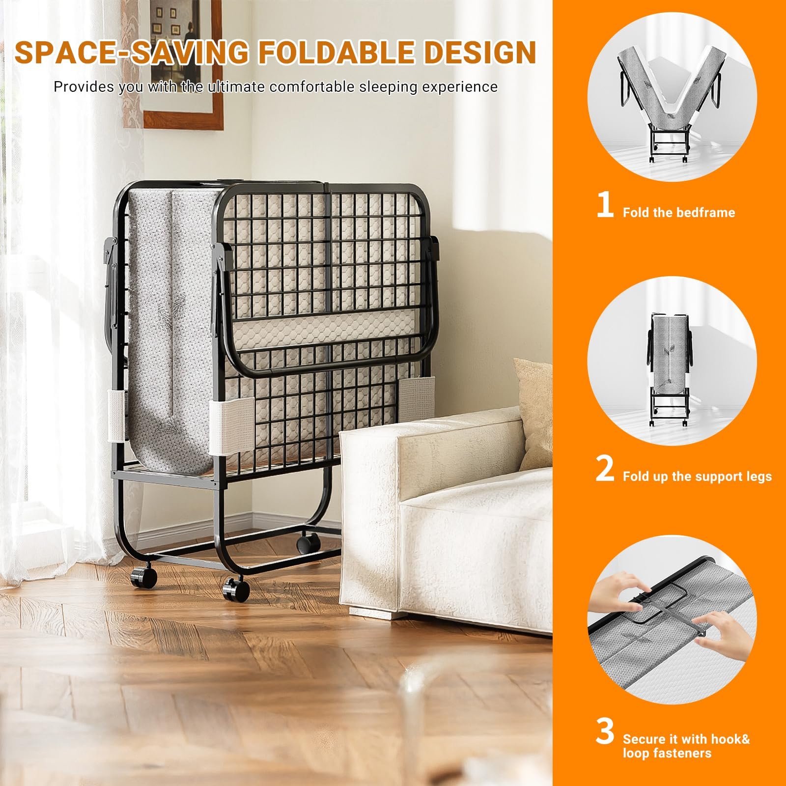 𝗘𝗮𝘀𝘆 𝘁𝗼 𝗠𝗼𝘃𝗲 & 𝗔𝘀𝘀𝗲𝗺𝗯𝗹𝘆: The folding bed on wheels makes it easy to transport and store when not in use. You can simply fold up the bed, lock the wheels in place, and roll it into a closet or storage area for compact storage. When you need to set up the bed for guests or yourself, you can easily roll it into position without having to lift or carry a heavy piece of furniture. No extra tools are needed, comes with a detailed illustrated manual, and the rollaway bed only takes minutes to set up.