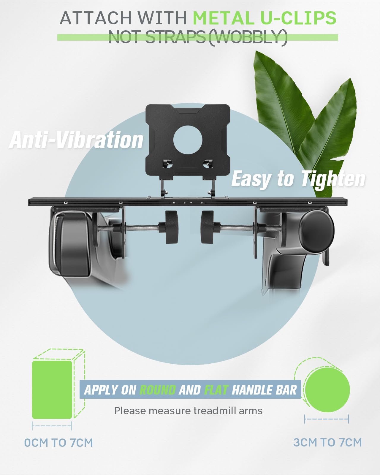 An Unique Sturdiness Ensurance: Universal metal U-shape clips, apply on round(1.2″-2.75″) and flat(0″-2.75″) handlebar. An slim 2.36″ cross bar maximize the “useful area” between two treadmill arms. Just fold up the tray then ready for a no impedes running.