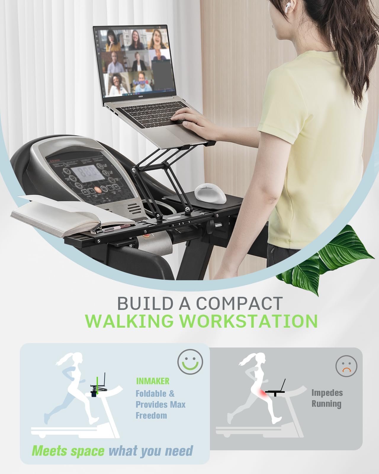 Max Freedom for Walking Workstation: Adjustale height and angle for different working postures. INMAKER treadmill desk attachment keeps neck, shoulders and spine extended while on a online conference, mail writing or video watching etc.