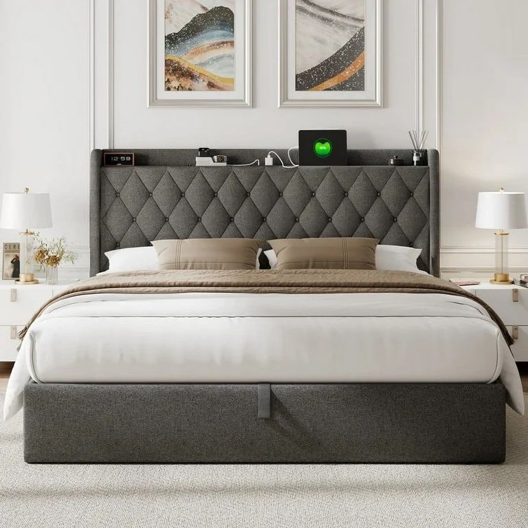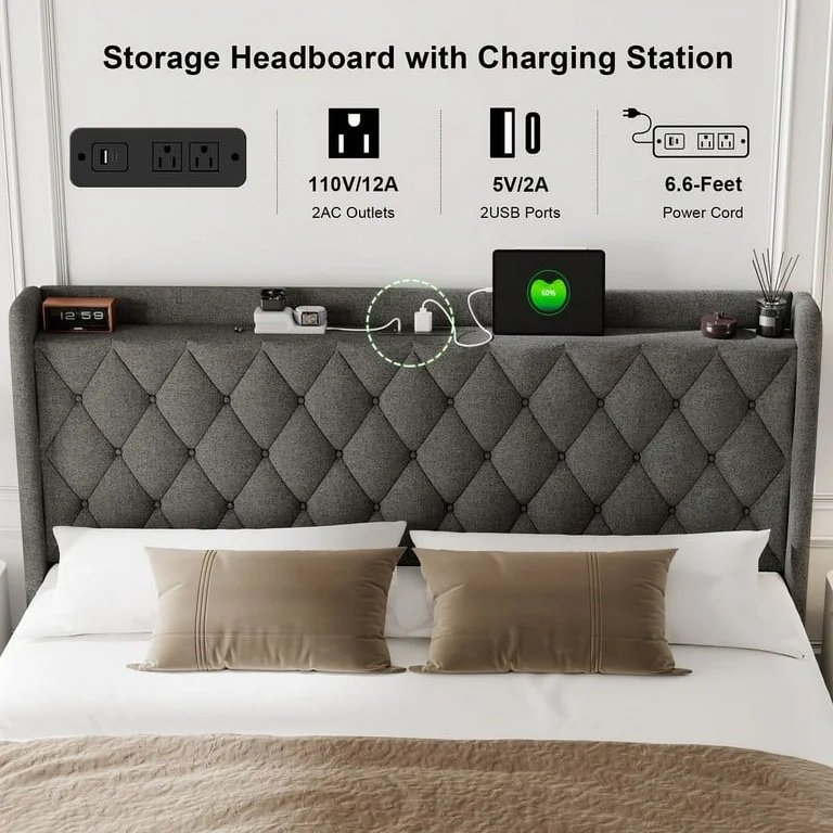 Convenient Charging Station: Headboard features 2 AC outlets and 2 USB ports for charging tablets, phones, and other devices.