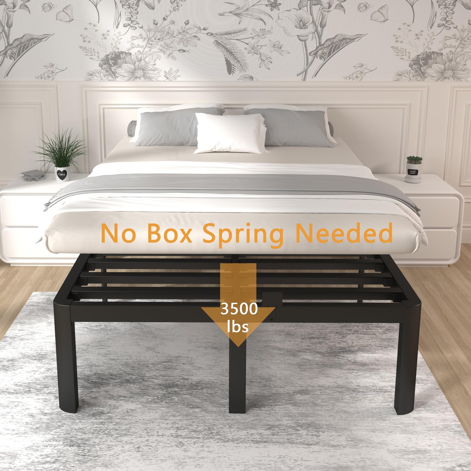 【16 inch King Platform Bed Frames】King metal bed frame is made of high-strength steel, and is strong enough to hold up to 3500 pounds, ensuring you a safe and stable sleep. Our king size bed frame has a unique white matte texture, which is more fashionable and durable, and the paint is not easy to age and peel off.
