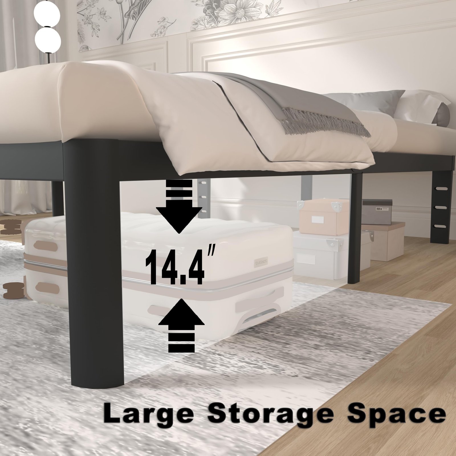 【DIY Headboard & Larege Storage Space】The metal king bed frame has 3 pre-drilled holes at the end of the bed legs, so you can DIY different headboards according to your needs. The platform bed frame king have plenty of storage space under the bed to store more clutter and easier to clean.