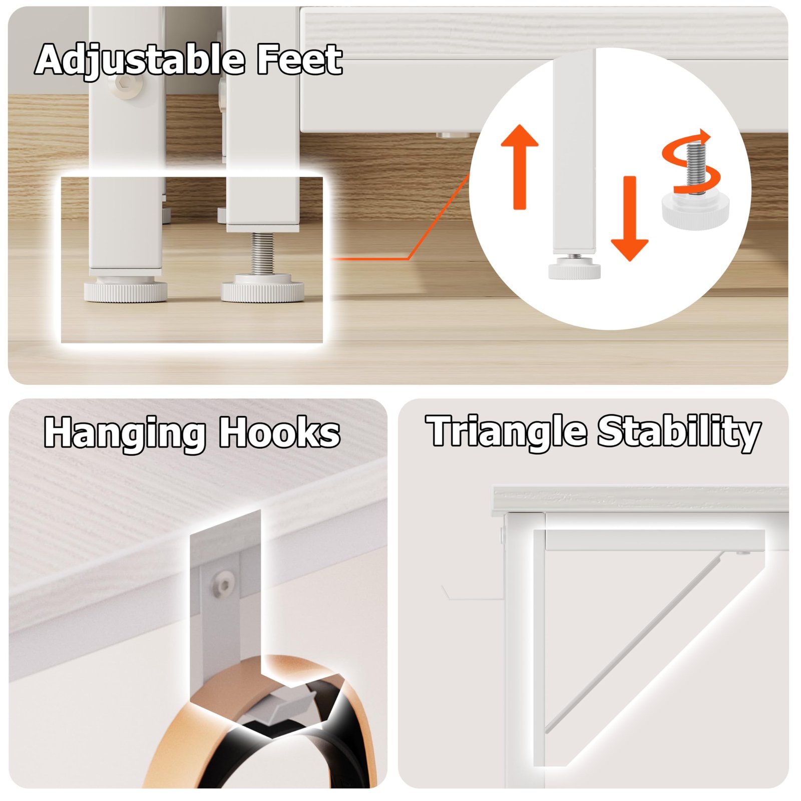 【Scratch Resistant Desktop】 The desktop has enough space for keyboards and office equipment, and the work surface is made of E0-grade particle board, which is waterproof and scratch-resistant.