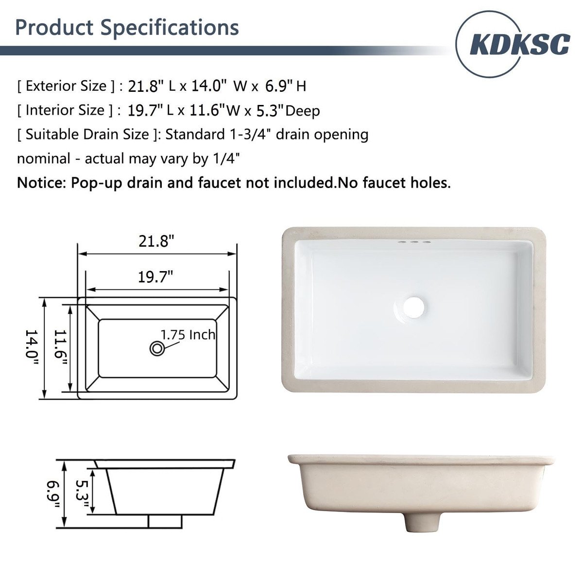 KDKSC 22″ Undermount Bathroom Sink Rectangular