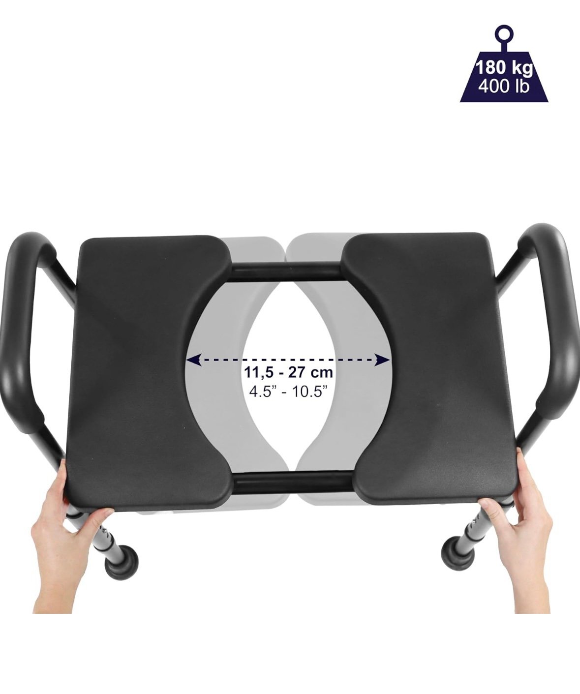 SAFE AND STURDY: Thanks to the structure and aluminium legs with non-slip rubber tips and firm and padded armrests, the toilet chair ensures the safety and stability of the user. The high quality materials ensure durability and strength, withstanding a maximum user weight of up to 400 lbs.