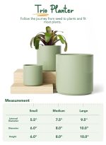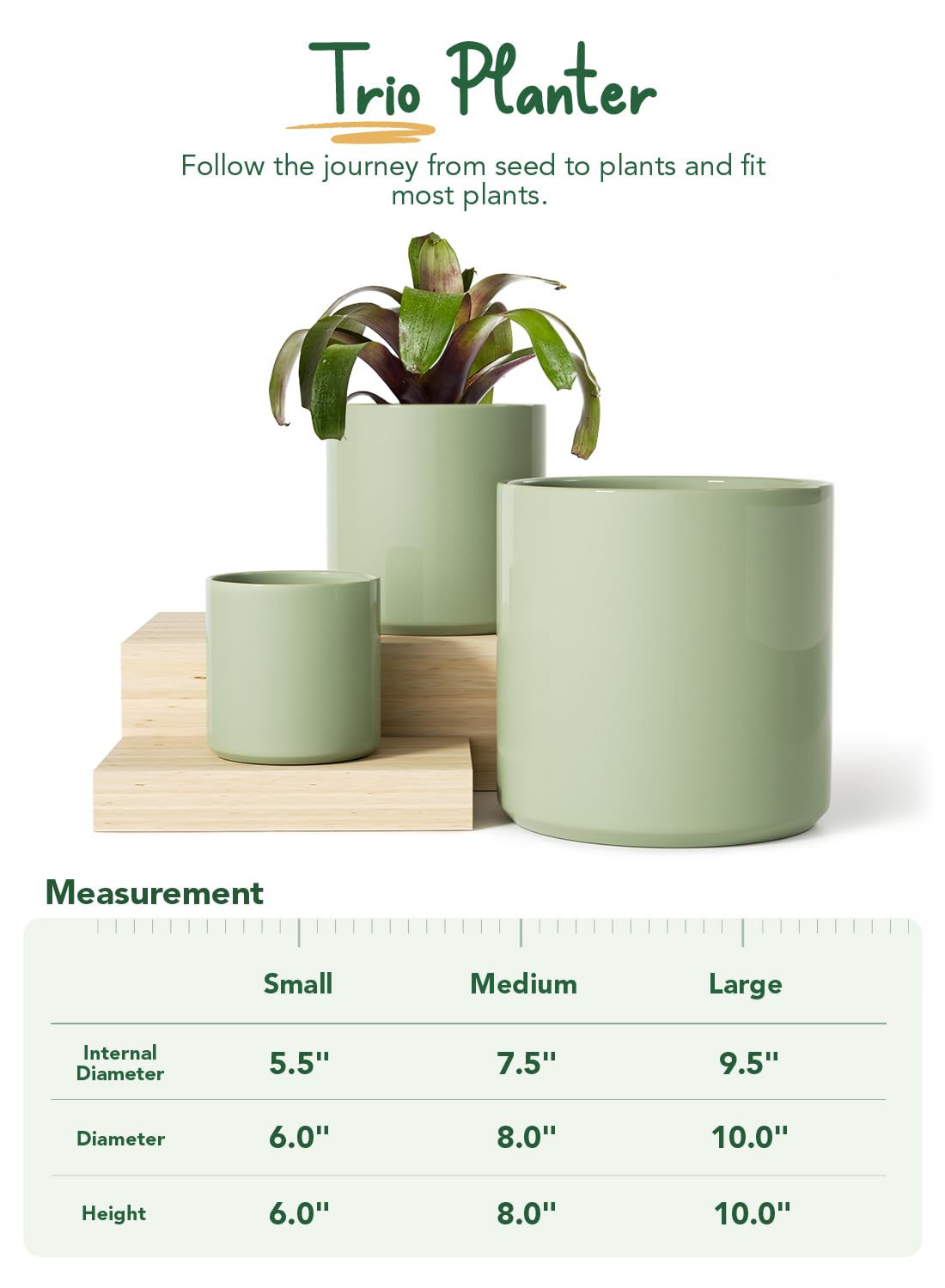 Large Set of 3 Planters Pot: Dimensions – small size: 6″x6″, medium size: 8″x8″, large size: 10″x 10″. Three small to large planter pots follow the journey from seed to plants, and fit most kinds of indoor plants, like snake plants, Africa violet, philodendrons, Monstera Deliciosa, Large Majesty Palm, etc. all the classic plants.