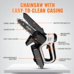 Multiple Safety Protection: the battery mini chainsaw has a double safety circuit design that stops the blades in case of contact loss to prevent accidental activations. The soft rubber handle provides comfort and non-slip cushioning. The thick dust protection plate prevents splashes of wood chips. The robust protective case provides protection during storage and is suitable for safe transport.