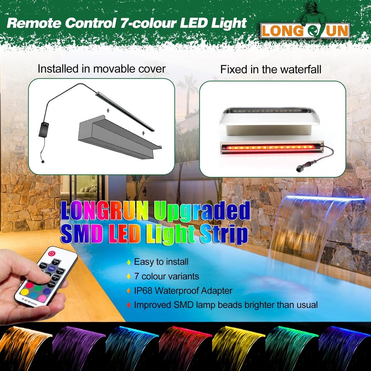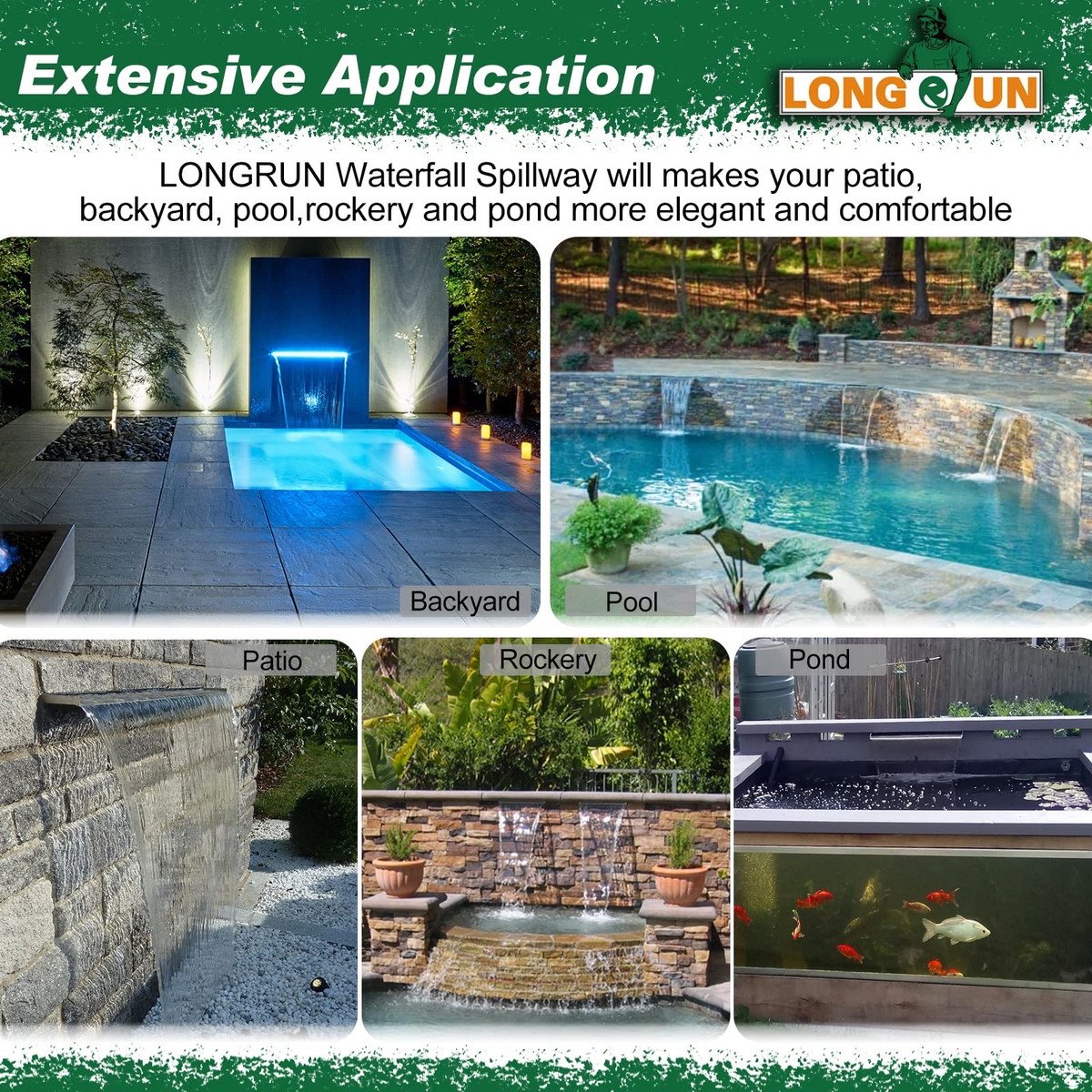 ?Decoration Waterfall?LONGRUN waterfall spillway will make a decorative addition to your garden patio pond or swimming pool, it makes them more elegant, fashionable and beautiful. The color change of LED lights and the gentle sound of water running make your patio more special at night.