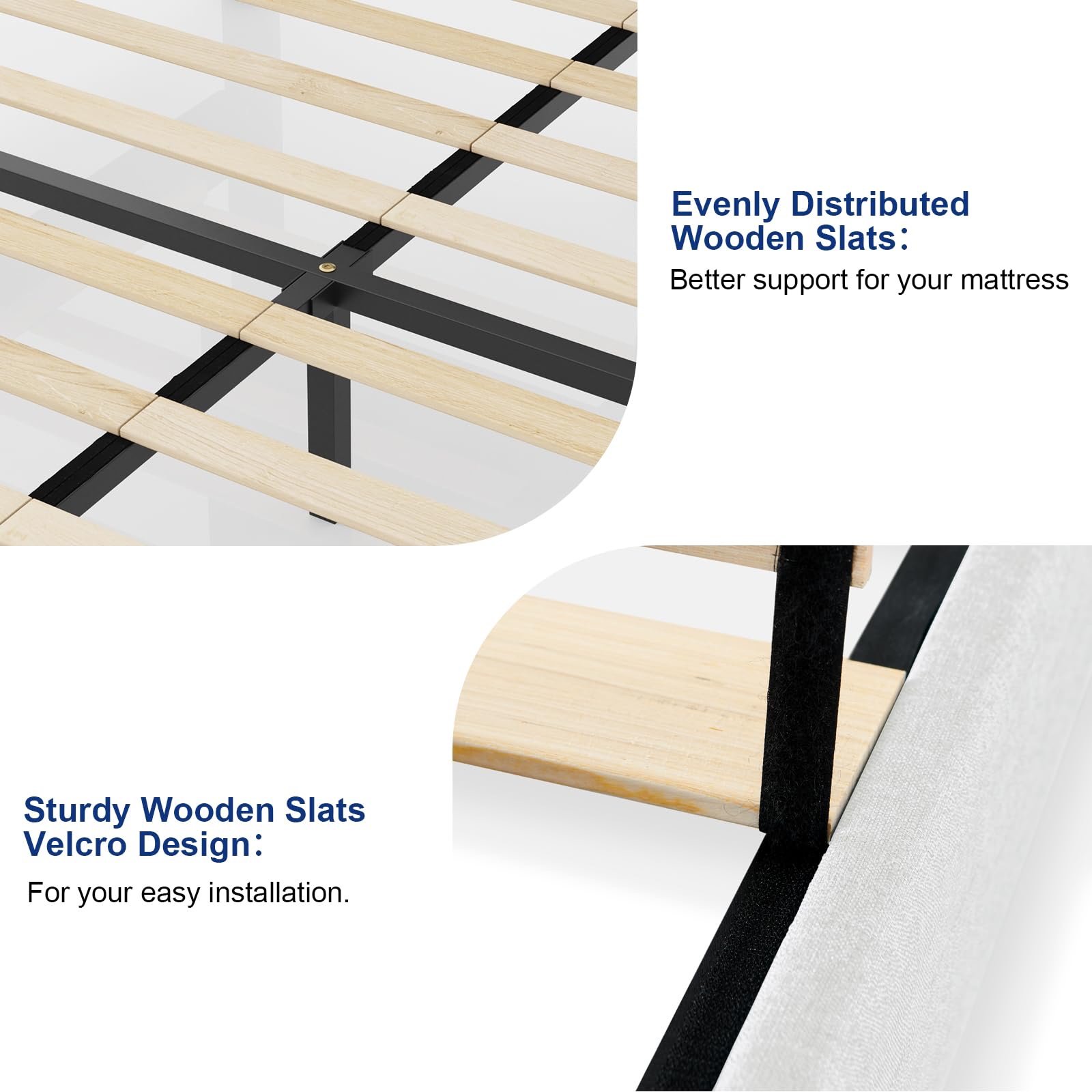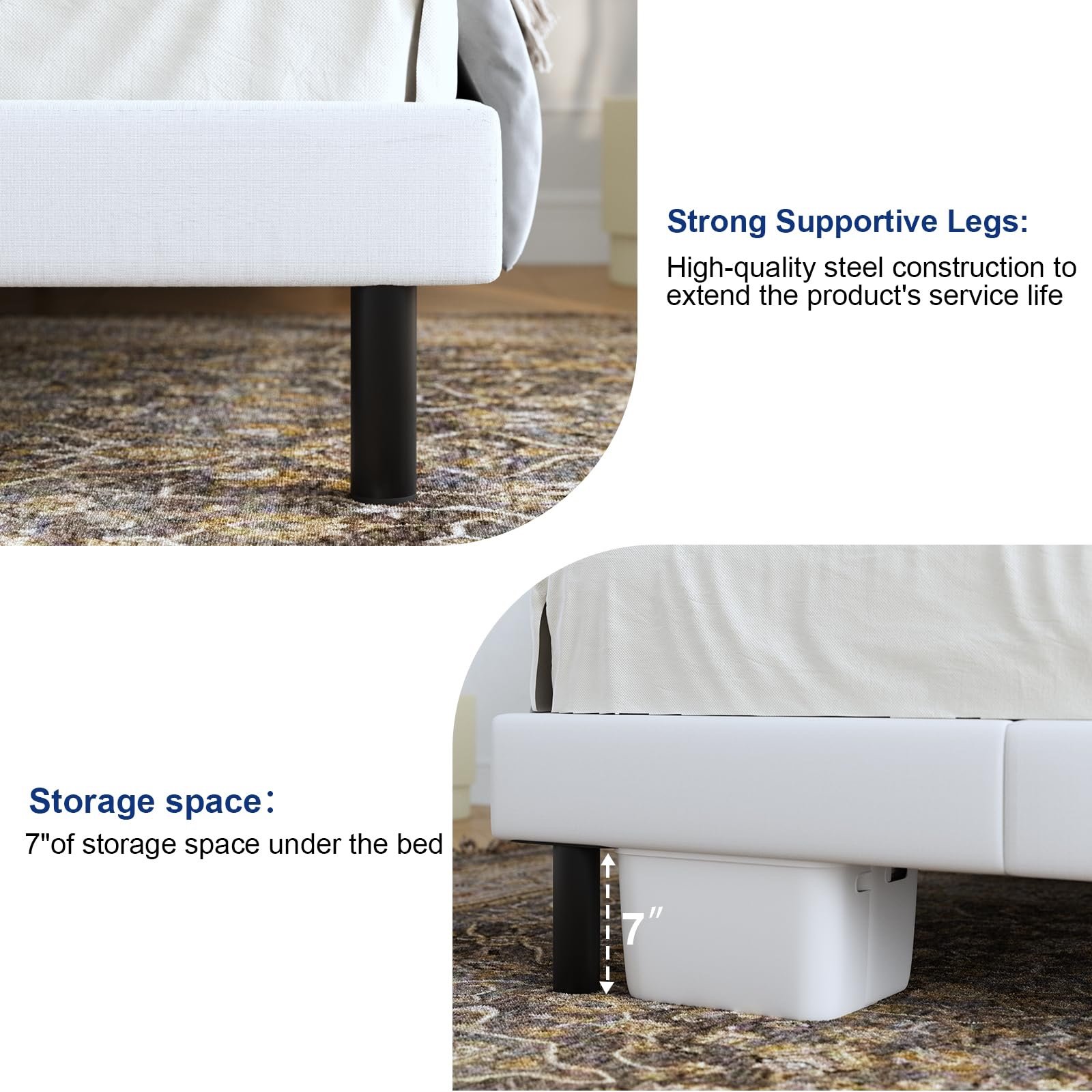 Robust Build, Long lasting: This platform bed features robust steel frame supports, ergoWithoutmically designed curved slat, and Sturdily triangular posts for enhanced stability. The Twin size can support up to 400 lbs, while the Queen/King size can support to 900 lbs