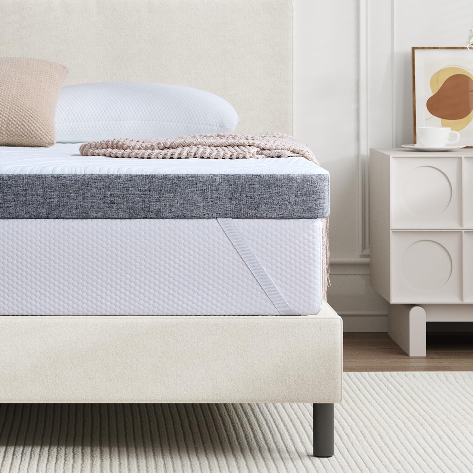 Equipped with elastic corner straps and an anti-slip bottom lining to help keep the topper securely in place during use.