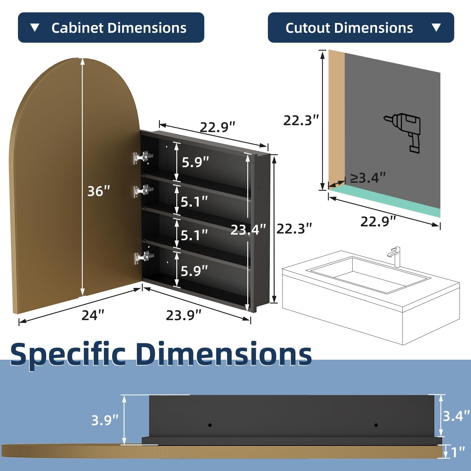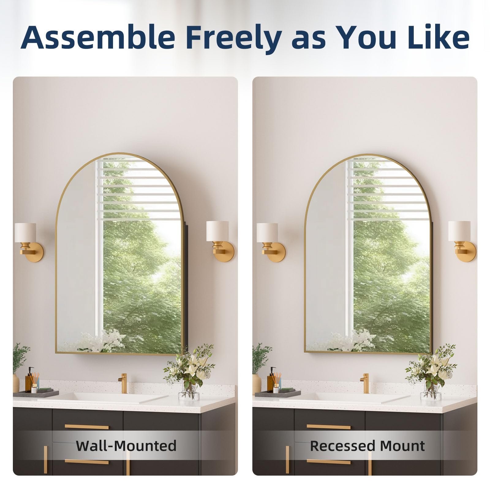 【𝐑𝐞𝐜𝐞𝐬𝐬𝐞𝐝 & 𝐖𝐚𝐥𝐥 𝐌𝐨𝐮𝐧𝐭𝐞𝐝】This gold arched medicine cabinet supports both recessed installation and wall hanging modes, with an in-wall size of 22.9×3.4×22.3 inches, which can be perfectly embedded in recessed spaces such as bathroom tile walls. The modern mirrored medicine cabinet comes with a clearly labelled parts kit and illustrated instructions for easy installation.
