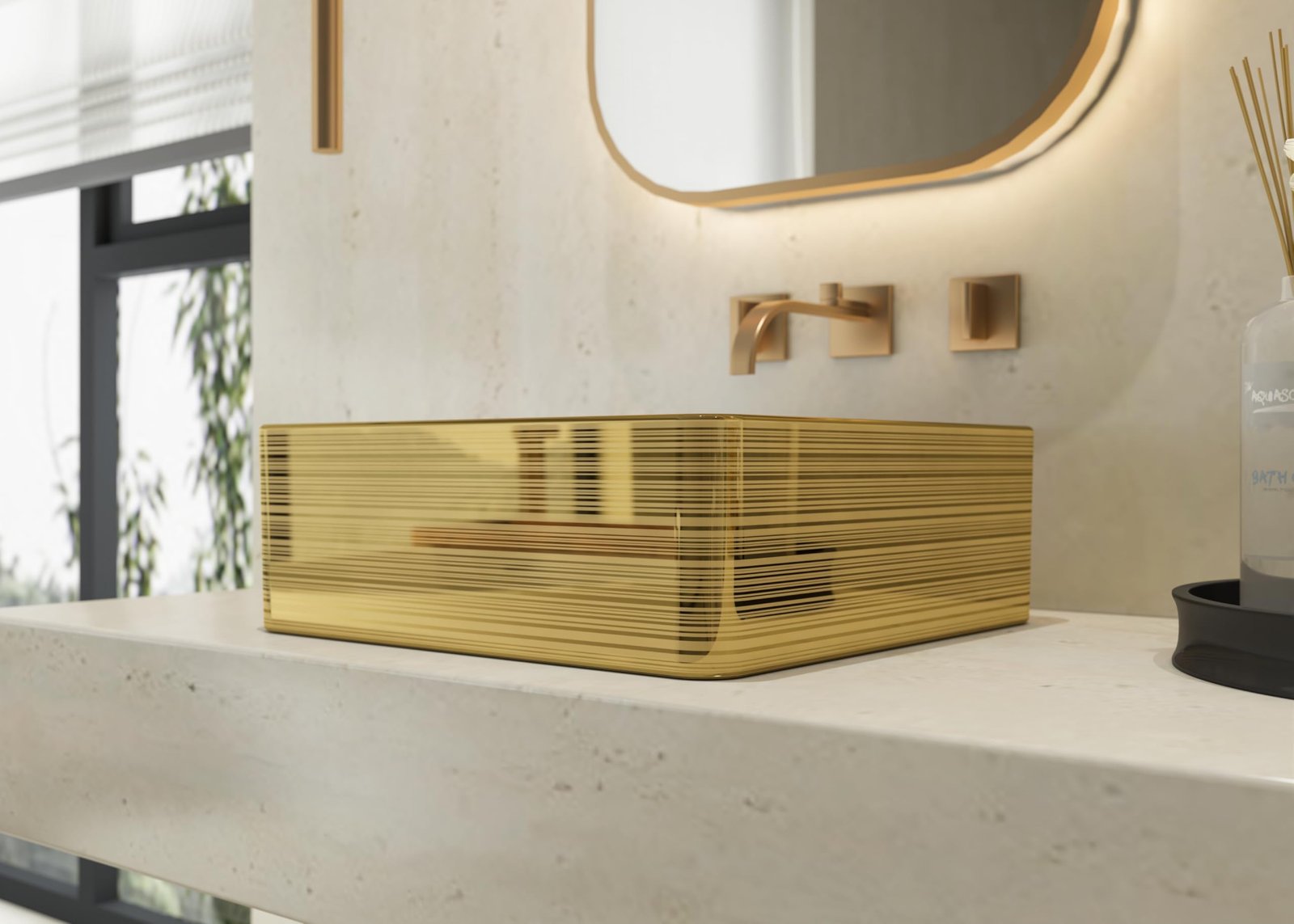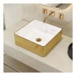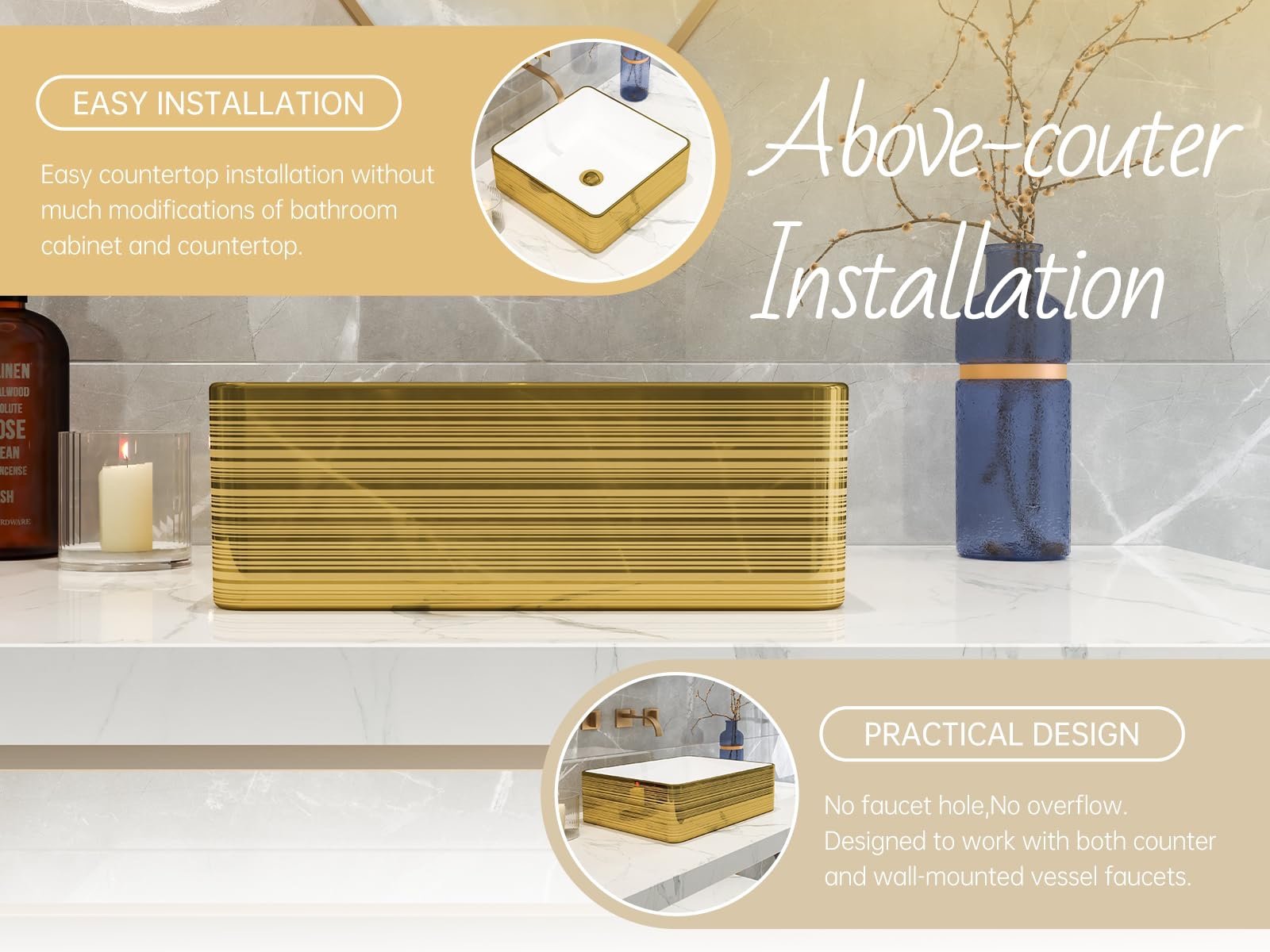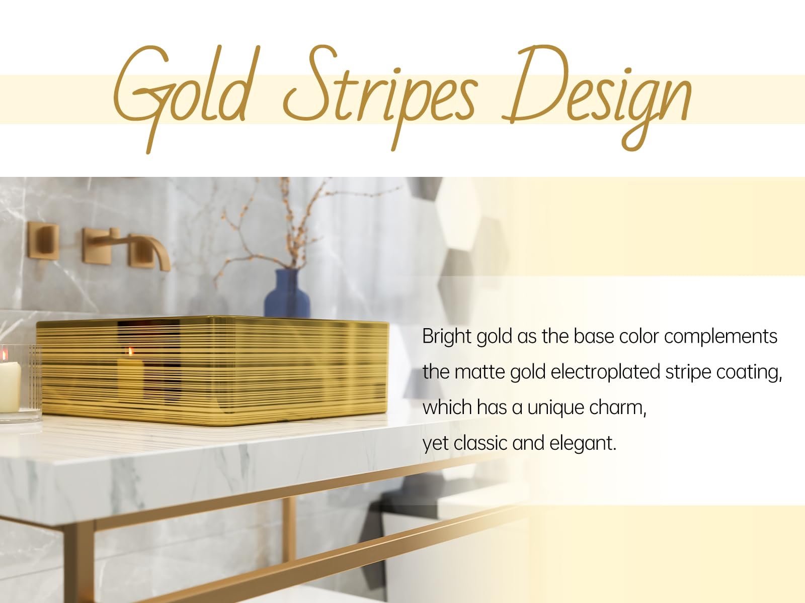 [ Luxury Golden Stripes Design ] : The art basin has no complicated design, classic square style with the shiny Gold basic color matching matte Golden Stripes make it looks Noble and Luxury, meticulously crafted as a work of art. The Golden Art Sink add a touch of light luxury and timeless elegance to your bathroom, and it complements most decor styles, giving your bathroom a new look.