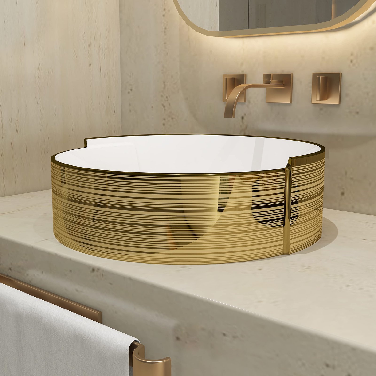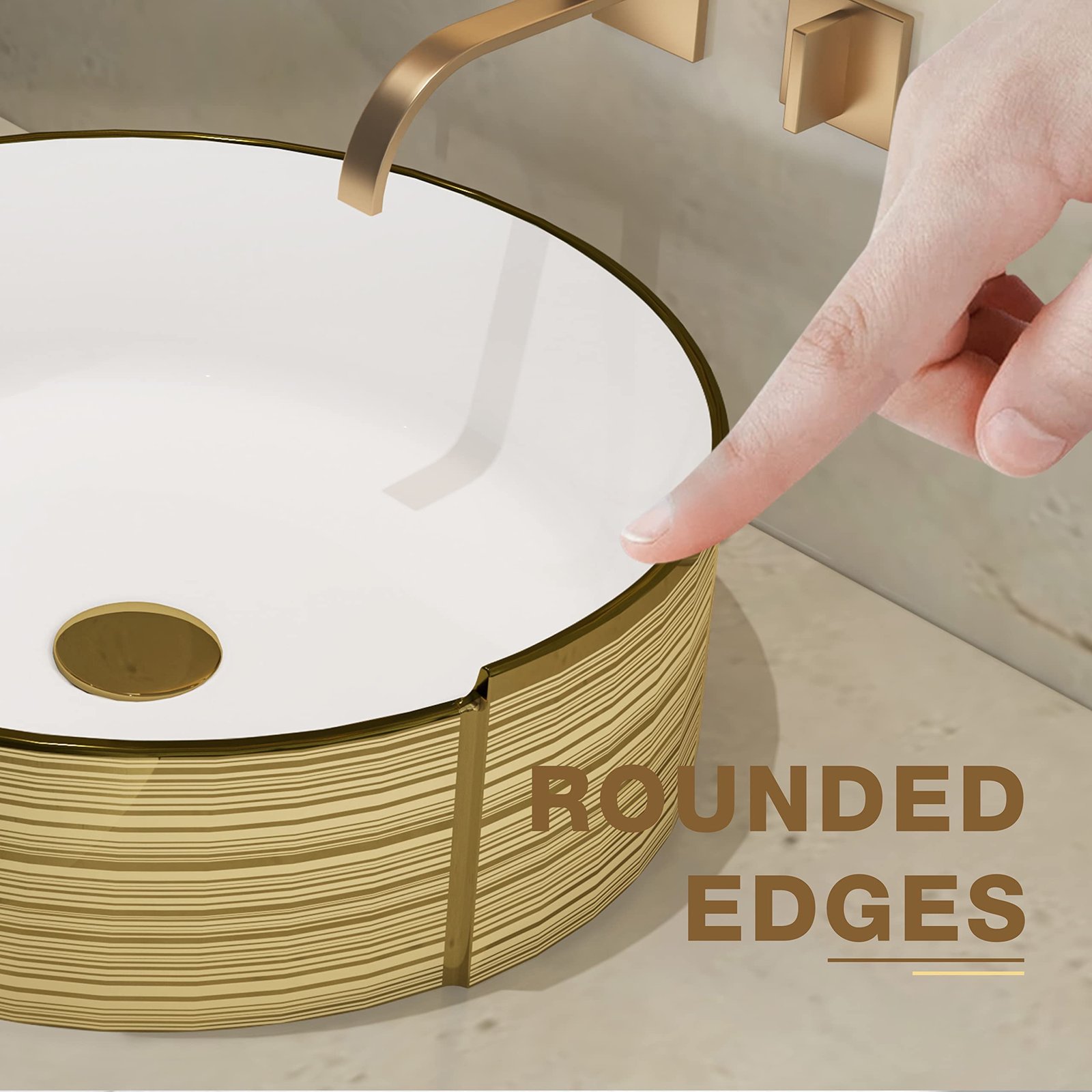 [ Luxury Golden Stripes Design ] : The round art basin has no complicated design, simple style but the shiny Glod basic color matching matte Gloden Strips make it looks Noble and Luxury, meticulously crafted as a work of art. The Gloden Art Sink add a touch of light luxury and timeless elegance to your bathroom, and it complements most decor styles, giving your bathroom a new look.