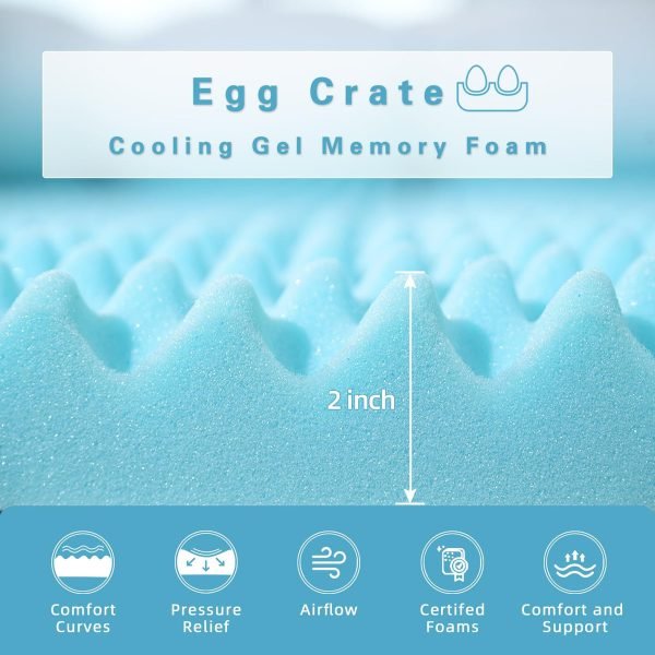 ?Cooling Gel Memory Foam?2 Inch gel memory foam in egg crate shape is designed to relieve pressure points and distribute weight, reduce body pressure. Egg crate promotes better air circulation.