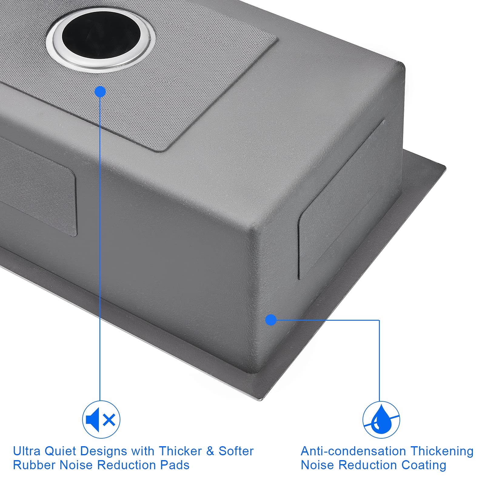 【Unique Design】Single bowl sink features an ultra-quiet design, with thicker and softer rubber noise reduction pads. The thick anti-condensation noise reduction liner absorbs sound at the source and isolates condensation water