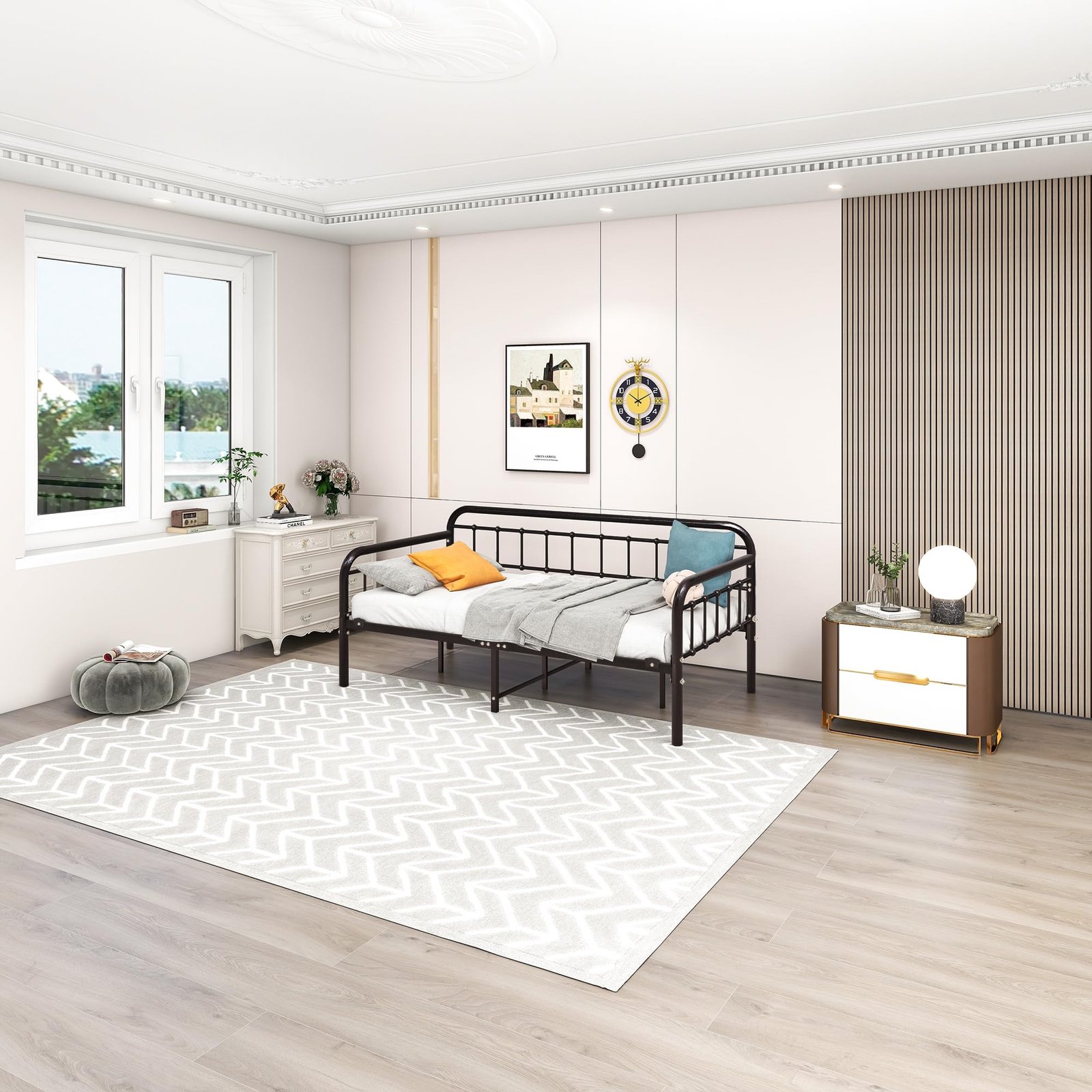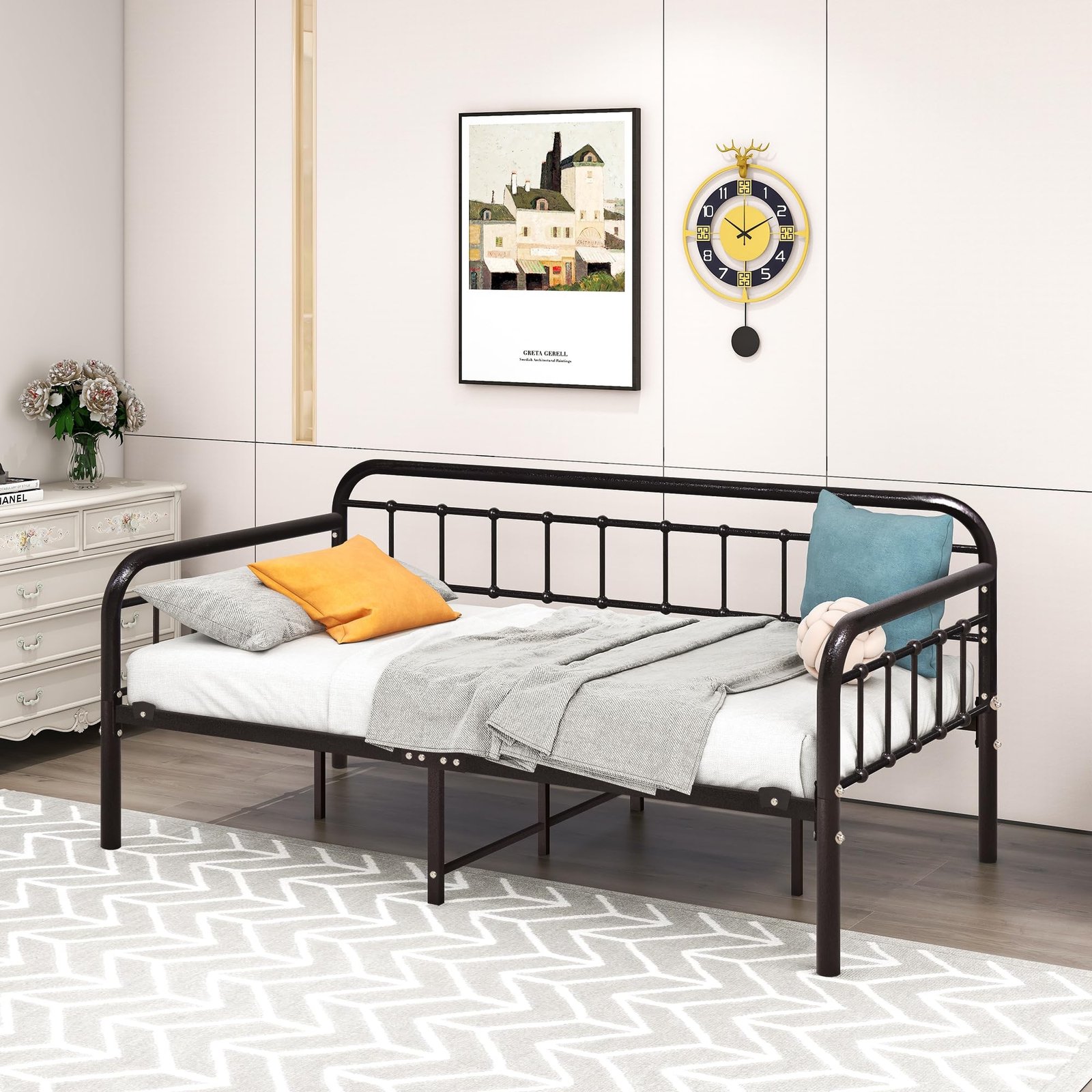 metal daybed, directly from a SGS and ISO9001 certified manufacturer with much OEM brand experience, features modern finish, heavy duty headboards, steel cross bars, support legs, strong package and etc. for durability.