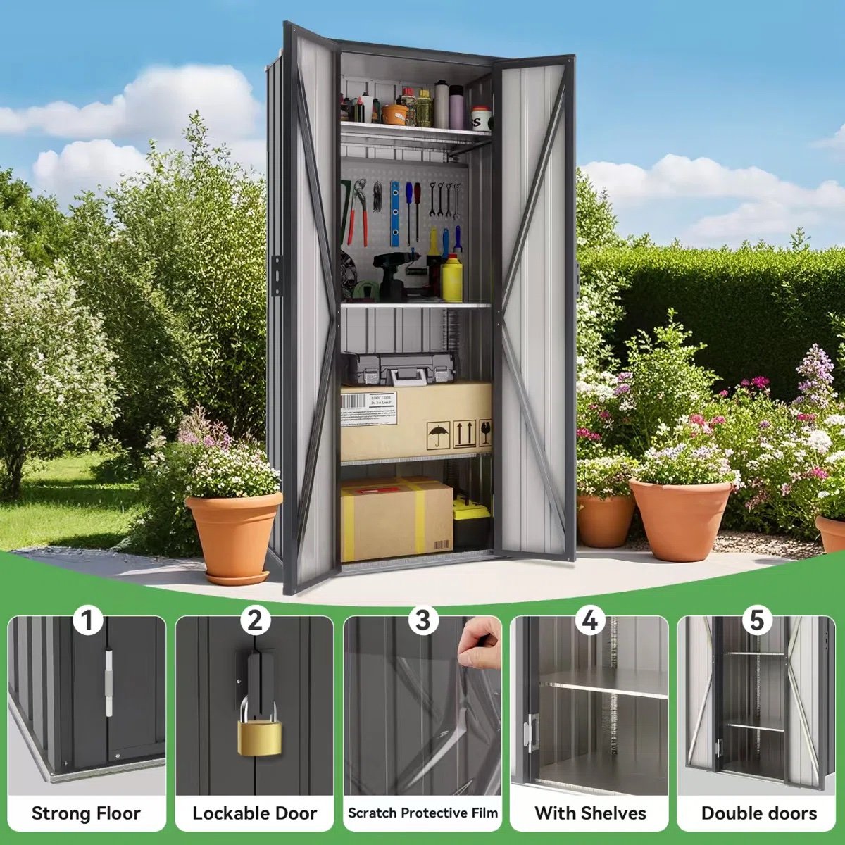 Sloping roof and lockable doors: The sloping roof design not only maximizes space but also prevents rainwater from accumulating on the top surface for extended periods. Furthermore, the inclusion of lockable doors facilitates access to stored items while enhancing overall security.