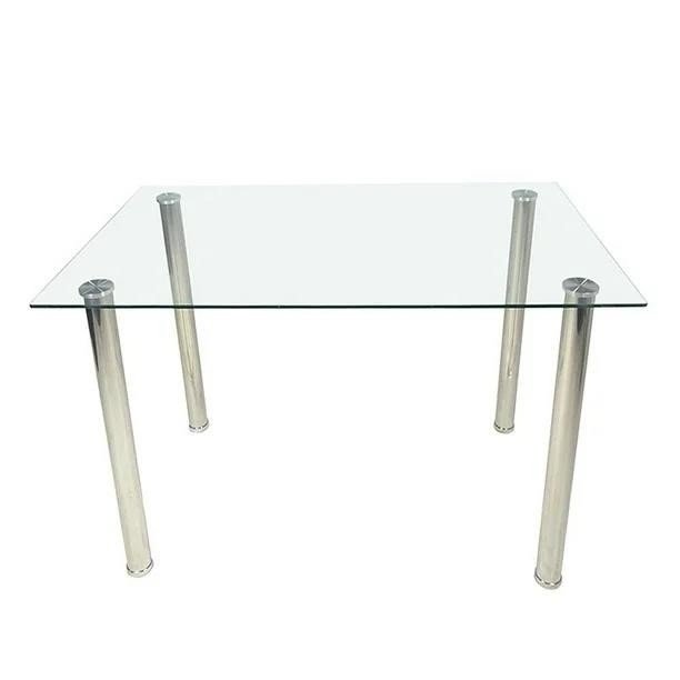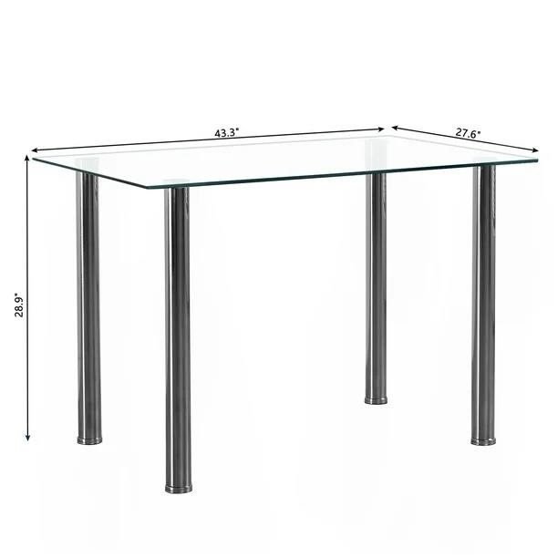 This dining table measures 43.3 x 27.6 x 28.9 inches (110 x 70 x 73.5 cm) and features an 8mm tempered glass top paired with a rust-resistant stainless steel frame. It supports seating for 4 people, ideal for small dining spaces. The tempered glass surface is smooth and easy to clean, while the sturdy steel frame ensures durability and a long service life.