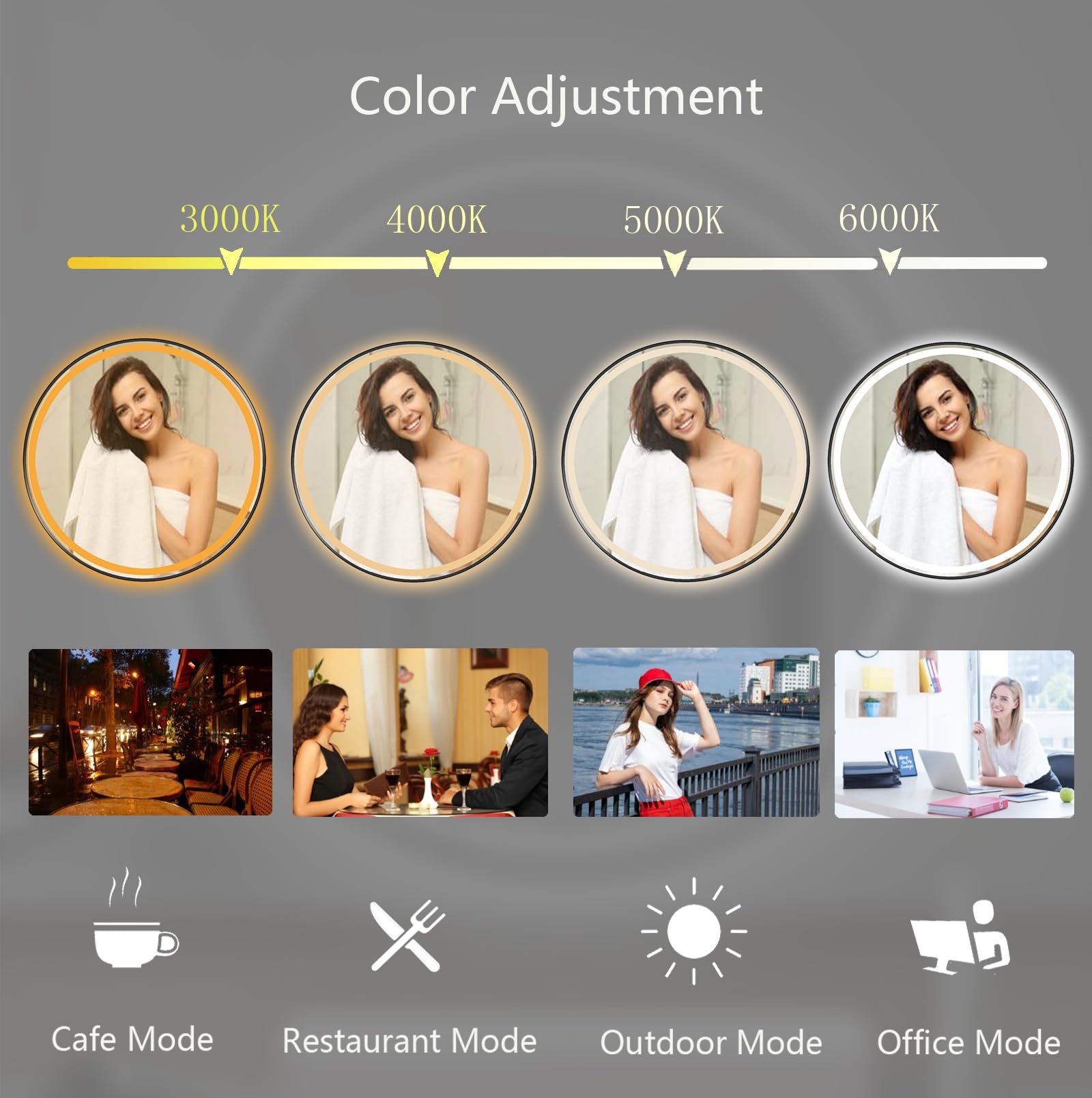 ✨【Adjustable Led Lights】Enhance your makeup experience with our LED mirror, offering a natural-like light with its 3000/4000/5000/6500K LED lights. A simple touch of the switch allows you to turn on the lights and adjust the color temperature. Say goodbye to shadows on your face while doing makeup, as this bright and versatile lighting is perfect for makeup application, shaving, and all your beauty needs.