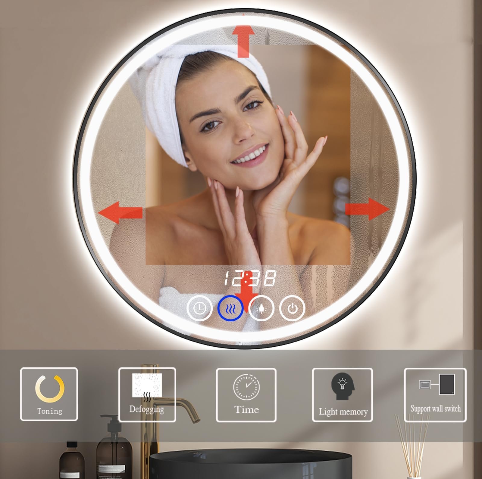 ✨【Anti-Fog Benefits】Our LED lighted mirrors are equipped with an anti-fog system, preventing the LED vanity mirror from getting foggy while using. The mirror has a touch switch that can separately control the anti-fog function during showers. This means you can use the mirror instantly after hot baths or showers, without the need to wipe it down or wait for it to defog. Enjoy a clear, fog-free reflection every time!