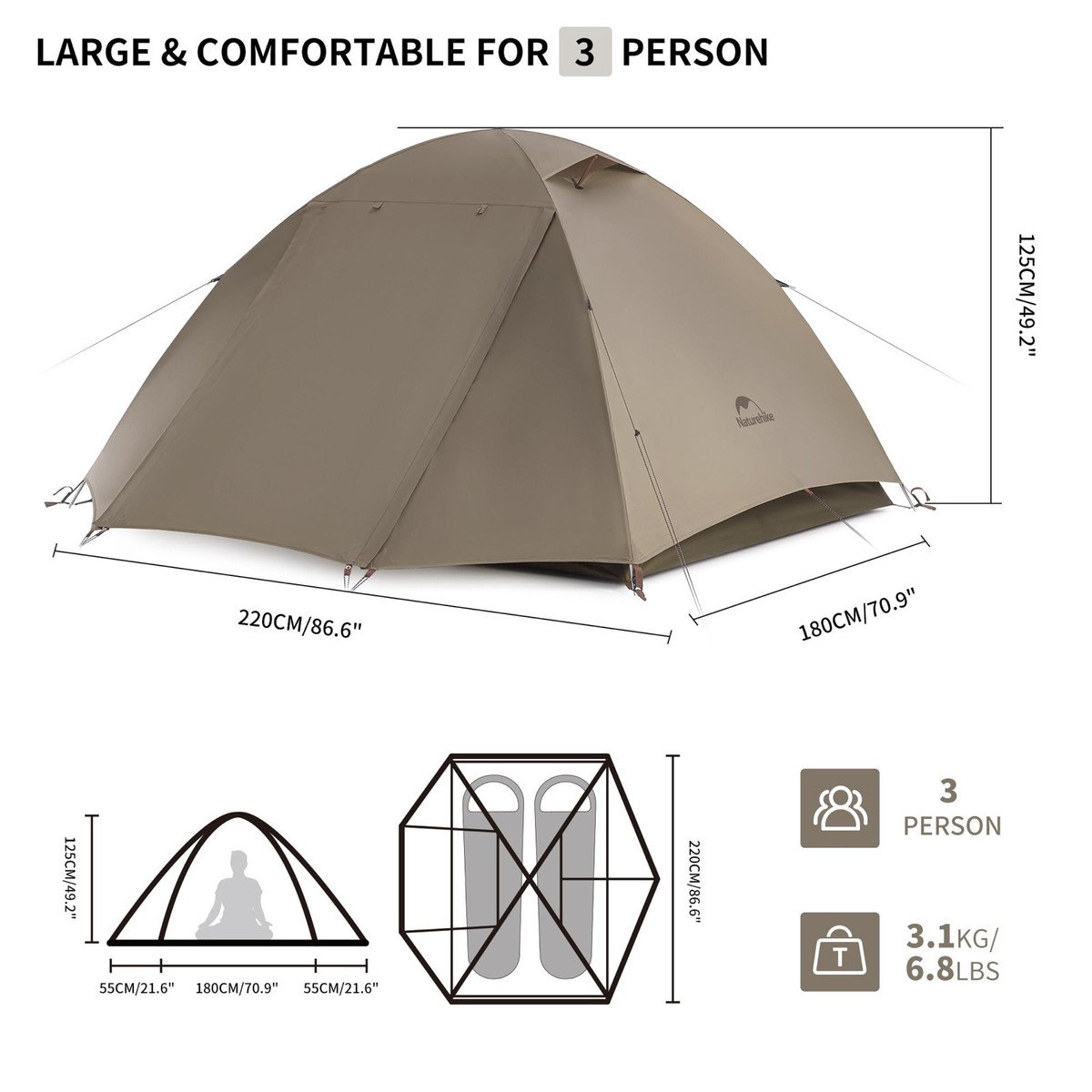 Lightweight 3 Person Backpacking Tent: Update Large Tent size for 3 Person Camping: (L x W ) 86.6 x 70.9 inch, with 49.2 inch tall than usual backpacking tent, you will have more head room to when stay in the tent. Weight only about 3.1kg/6.8lbs, small packed size: 52 x 16 x 16cm/20.5 x 6.3 x 6.3 inch. Ultralight and portable for backpacking and cycling travel.