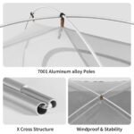 Easy Setup Tent for Camping: The tent is X cross structure with 7001 aluminum alloy tent poles, one can easily set up the tent in 5 minutes, and high quality aluminum alloy poles is tough, durable and more lightweight than the usual fiberglass poles.