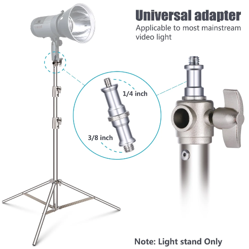 Reversible 1/4” to 3/8” Adapter- With 1/4” & 3/8″ threaded ends, the universal screw adapter is compatible with different accessories and light fixtures. A 3-way mounting interface allows you to mount in vertical and horizontal orientations