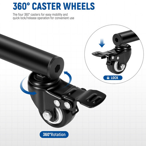 The base has four casters that rotate 360° for easy positioning. Each caster has a foot-operated locking mechanism.