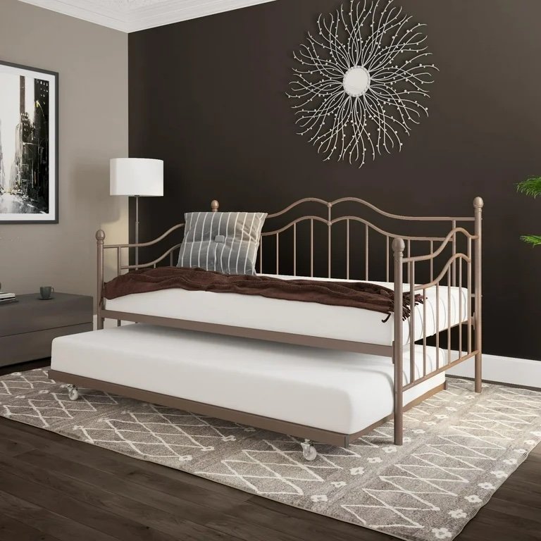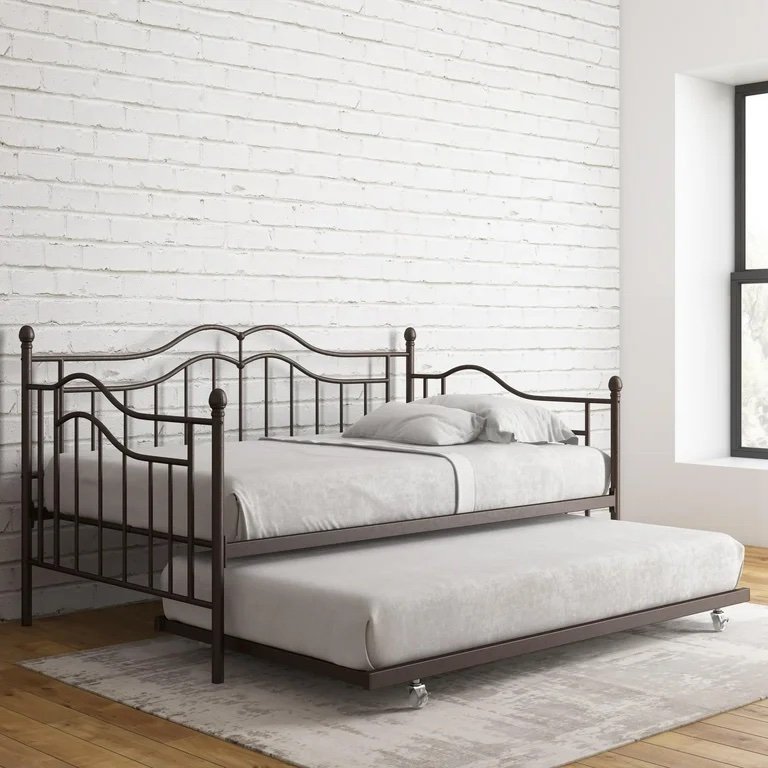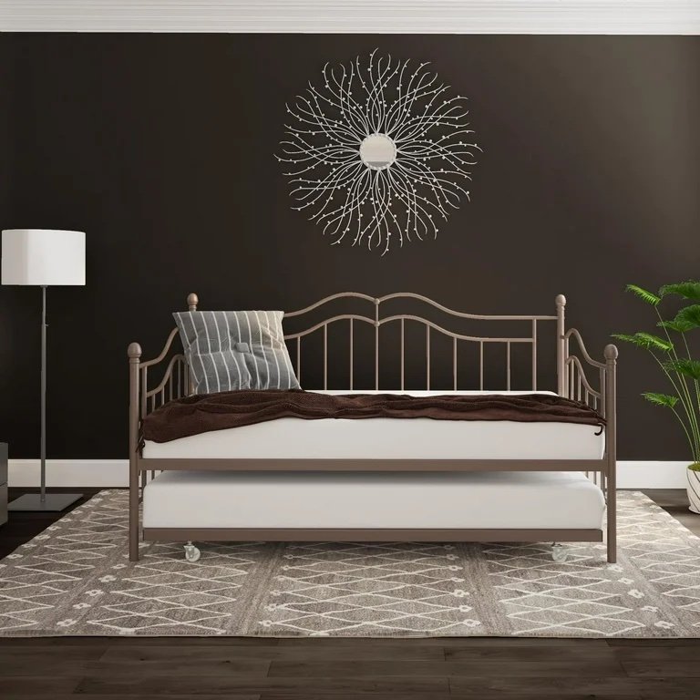Inspired by elegance and class, the DHP Tokyo Metal Daybed and Trundle is sure to be a statement piece in any living space. The soft curves, intricate lines on the headboard and footboard exude a timeless appeal that never goes out of style! Perfect for sleeping or relaxing, the DHP Tokyo Daybed is an attractive addition to your decor and comes with a very practical trundle. When you are hosting overnight guests and need some extra beds, simply pull out the trundle and lock it into place. It is that simple! The next morning, simply roll back under the daybed for neat and easy storage. Paired with contemporary or country-inspired furniture, the DHP Tokyo Metal Daybed and Trundle is guaranteed to add some charm and character to your room! Ideal for your living room, guest bedroom, home office, or even your loft space! Available in multiple colors to suit your home decor style.
