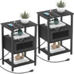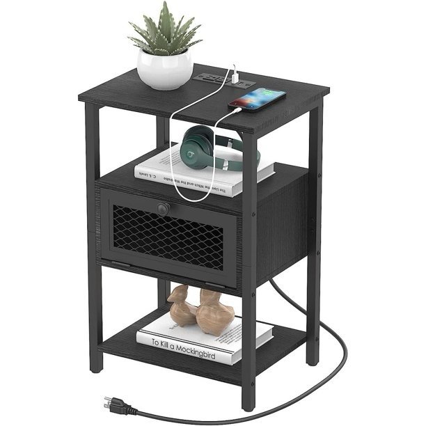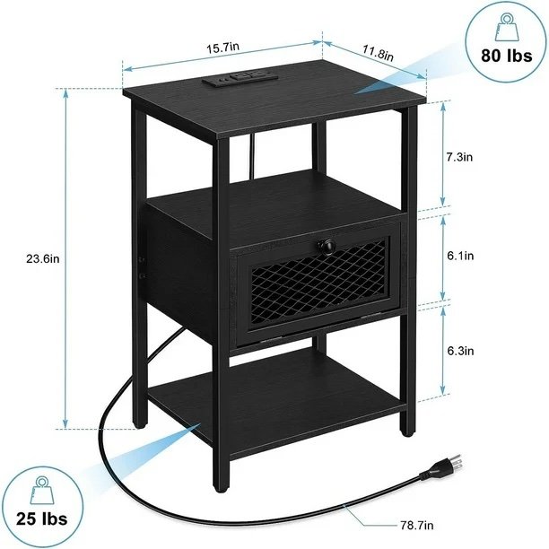 - Nightstand with Charging Station: A nice choice when outlets are limited. The nightstand with dual 3-prong outlets and USB ports provides enough charging places for you. Besides, a 6.5ft long power supply cord would definitely make our small end table with a storage shelf a great accompaniment for your bed or living room sofa.