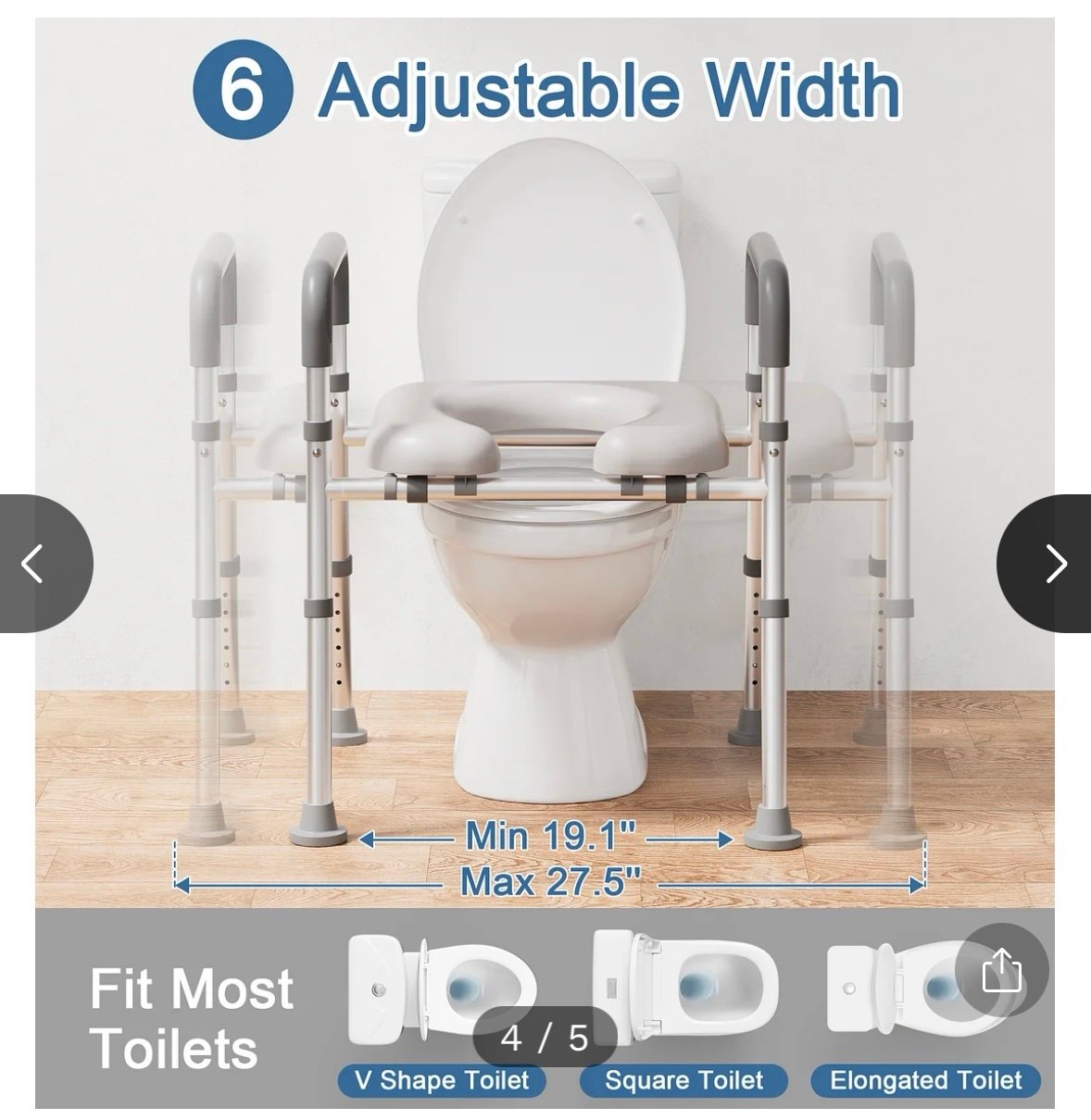 Adjutable Height & Width. The toilet seat riser for seniors can be adjusted in height (floor to seat) from 18.1” to 23” and in width from 19.1” to 23.2”, making it suitable for elderly, handicap, pregnant and those recovering from surgery or injury, and compatible with different toilets