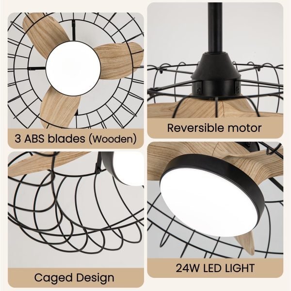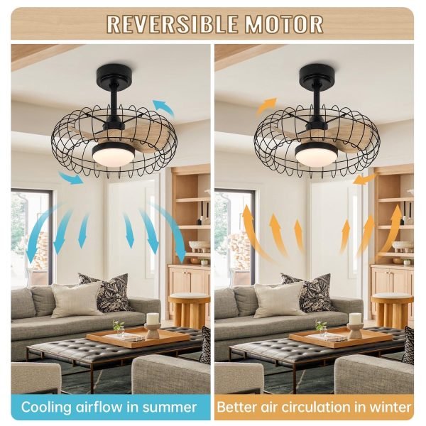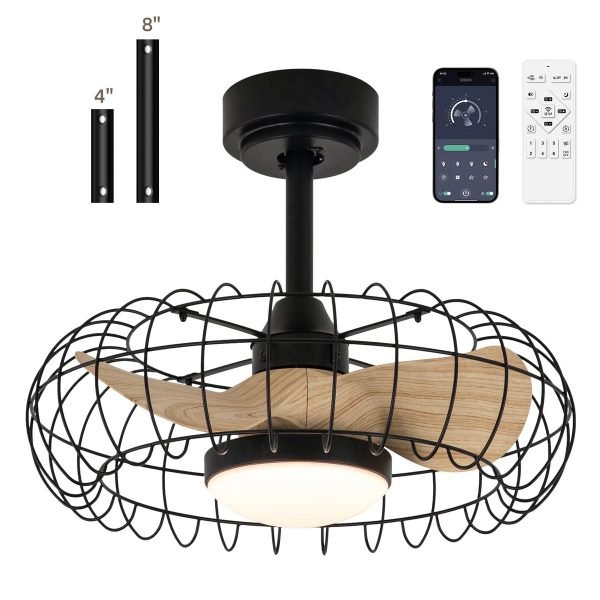 Low Profile Ceiling Fan with Light: 20 Inch Caged Ceiling Fan with 3 Wood Grain ABS Blades, Size: 20*20*20 inches (with 5″/10″ rods), can also be mounted on sloped ceilings no larger than 15 degrees.LED Caged Ceiling Fan’s Matte Black Cage with Wood Grain Colored Blades will bring a distinctive and sophisticated touch to your room. This rustic ceiling fan light is perfect for dining rooms, kitchens, living rooms and bedrooms (for rooms from 100 square feet to 200 square feet).