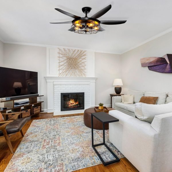 Black Ceiling Fan with Light: This rustic ceiling fan with light has 6 blades and 5 light base for optimal lighting (bulbs not included). Its hollow-up caged design is convenient for changing light bulbs and provides greater illumination. Choose from 5? or 10? downrods to match your room