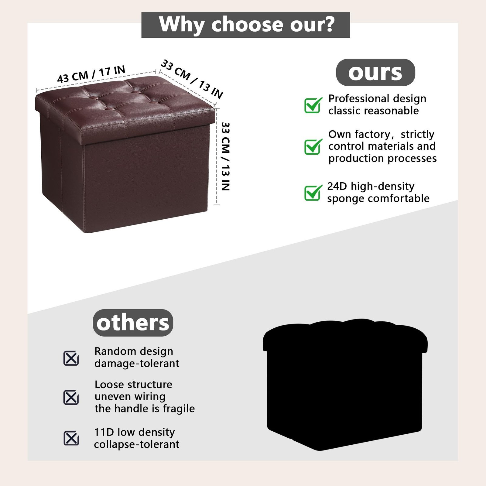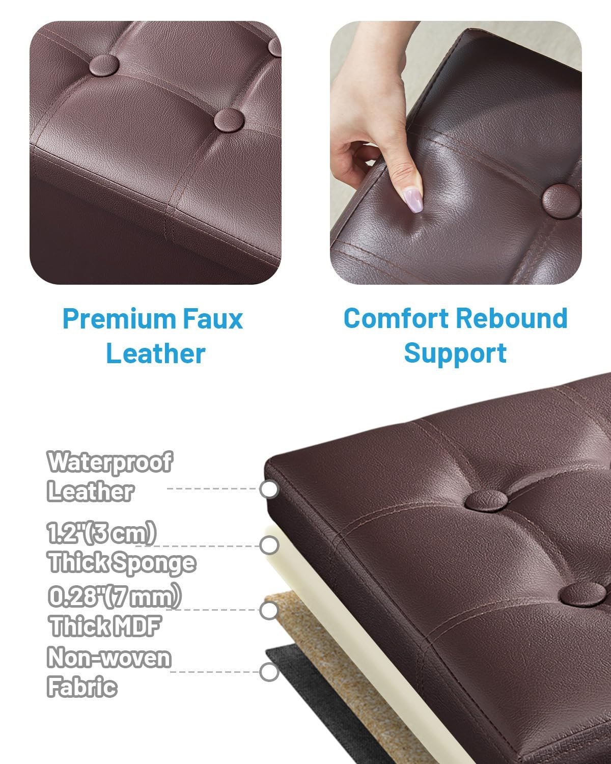 - 【Comfortable and Durable】This storage footstool is made of high-end leather fabric, which is odor-free, filled with high-resilience foam inside, and the thick cushioning pad brings you a more comfortable experience when you sit or rest your feet. Our folding storage foot rest can durable construction ensures that the ottoman will last in your home for long periods of time.