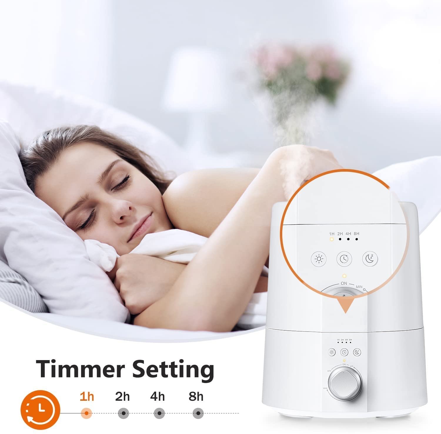【4 Timer Options】: Select from 1 hour, 2 hours, 4 hours, 8 hours or continuous timer options; the air humidifiers will stop misting to prevent the device from overheating when the water is drained and the LED indicator will shine red