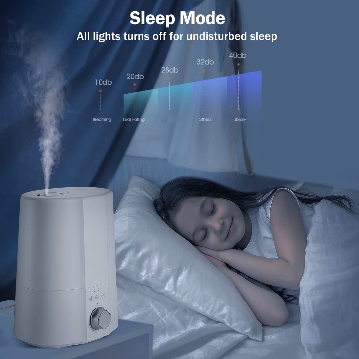 【Sleep Mode & Ultra Quiet Operation】: Near-silent noise levels and a display-off feature help you sleep through the night while the humidifiers for baby works. Operating at only 28dB; indicator lights on the ultrasonic humidifier turn off at night for a disturbance-free sleep