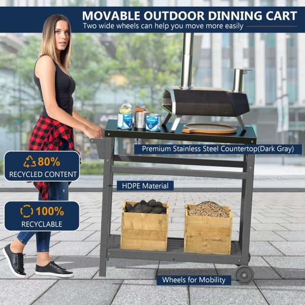 [Outdoor Pizza Oven Grill Table Prep Cart ]You can roll it across your yard to the BBQ area .This is not a super lightweight plastic prep table. It has stainless steel top with HDPE frame. The prep cart is around 40 pounds. You can use it for portable barbecue grill or put your pizza oven on it. It’s very easy to roll by slightly tilting it with the attached handle and moving it to wherever you like. The table cart still has a practical size for moving around or getting through any doorway.