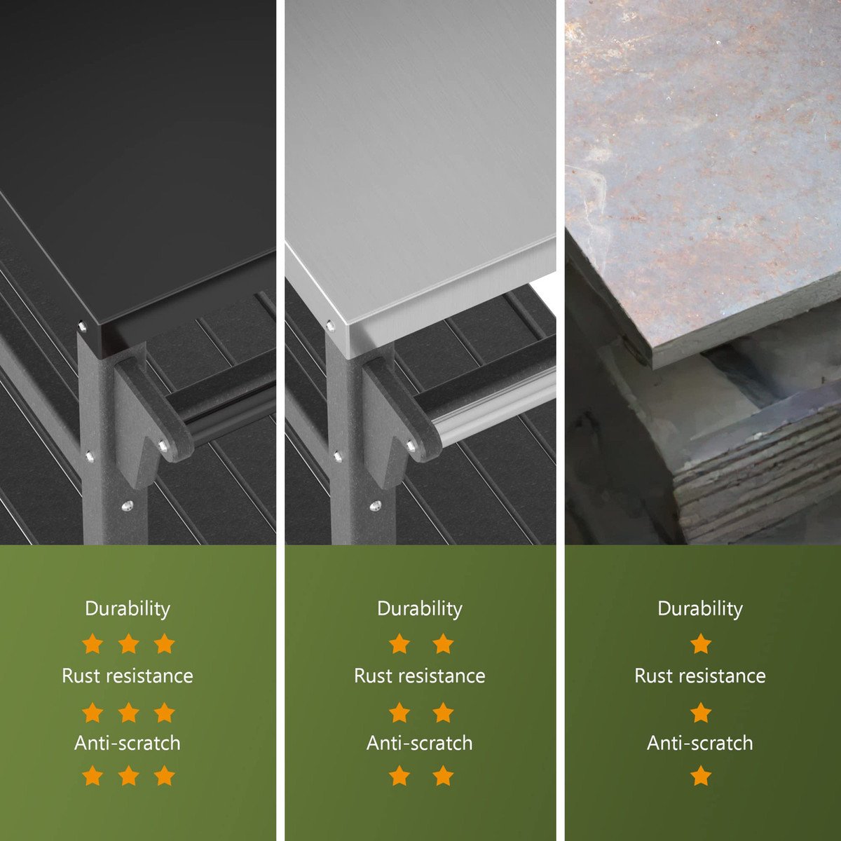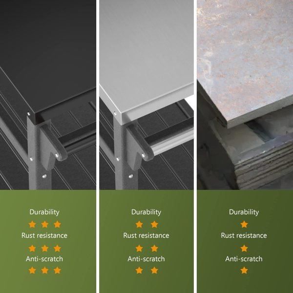 [Rust-Proof Stainless Steel Countertop]If you tend to use this outdoor prep table frequently, then choosing a stainless steel countertop is more suitable. One reason is that this stainless steel countertop is easier to clean, and will not deform and discolor. The stainless steel used for the countertop is very thick and high-quality. Stainless steel countertop has a very long service life and is suitable for long-term use.