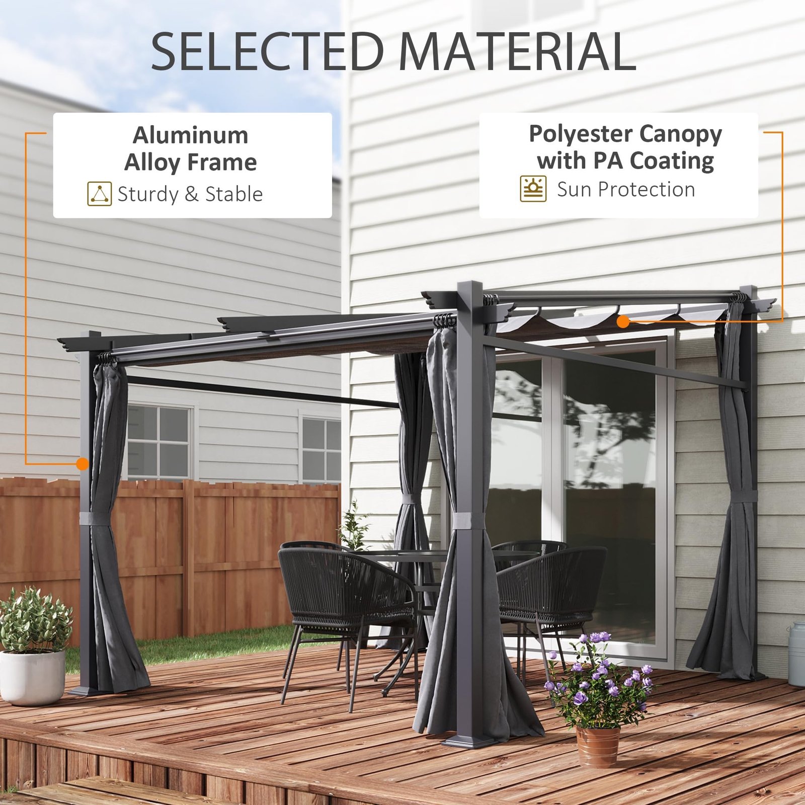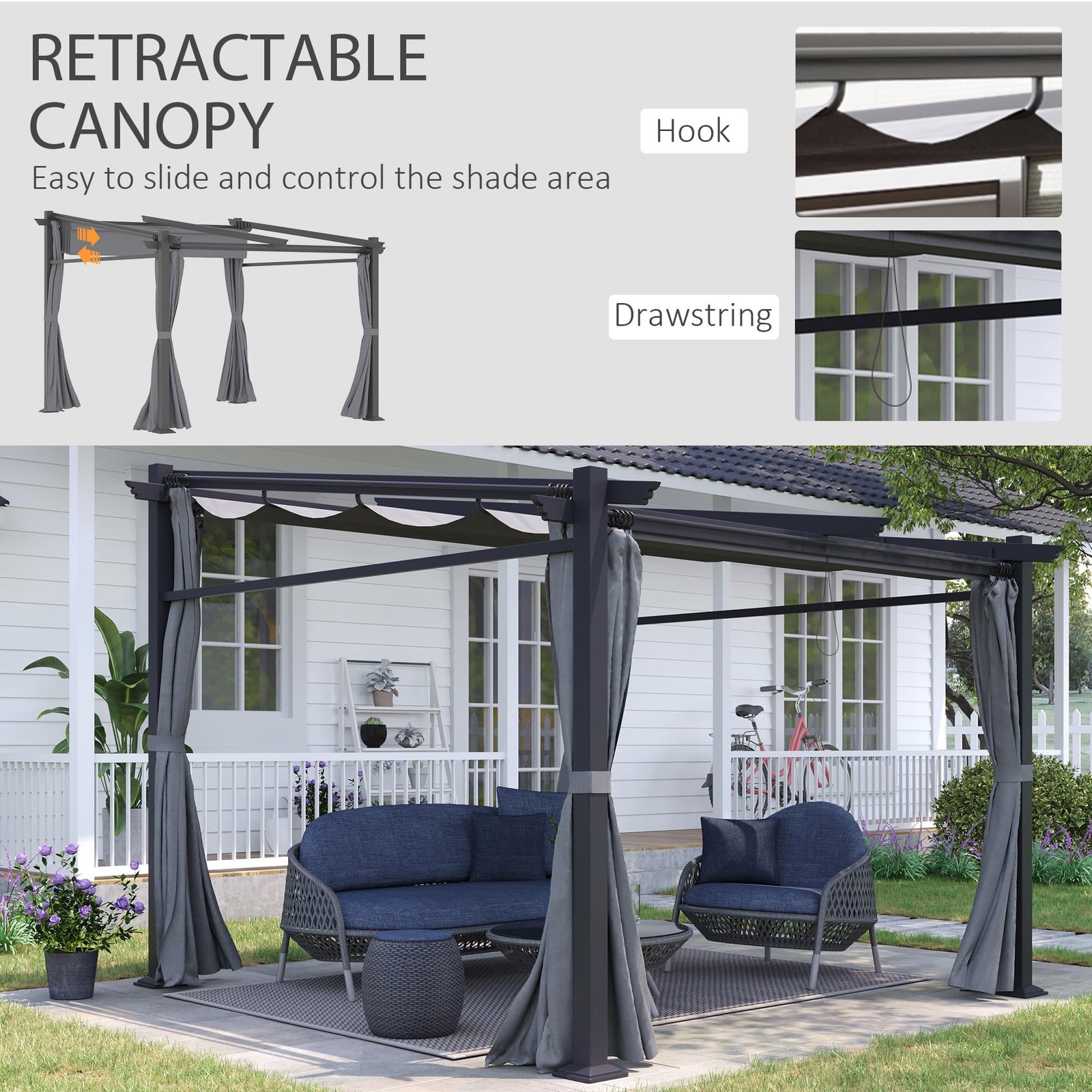 Retractable Canopy: Control the balance of shade and sun with a retractable pulley system, allowing you to move the canopy exactly where you need it. With PA coating, the outdoor canopy protects you from harmful UV rays.