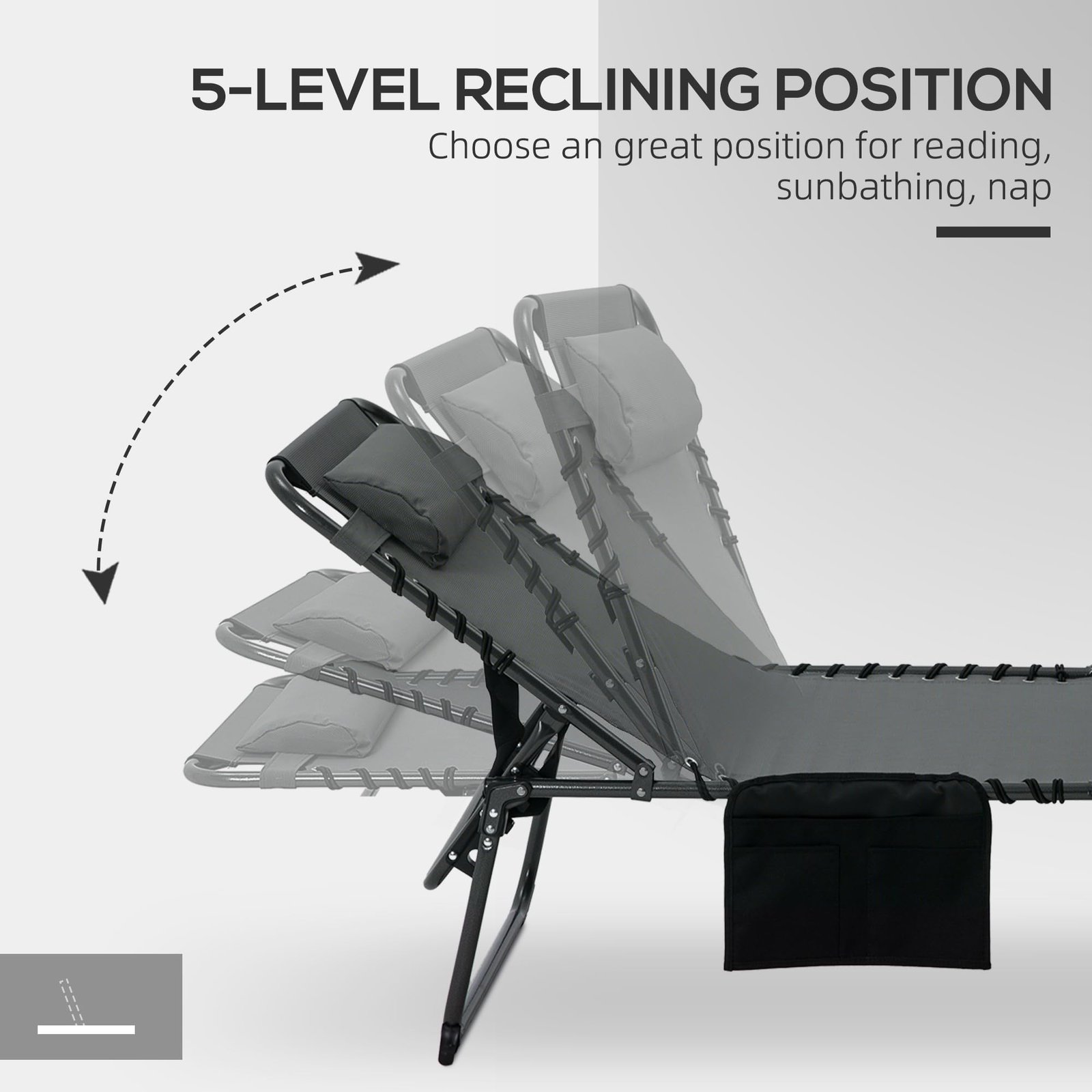 Outdoor Lounge Chair with Storage: Feel free to fully relax, knowing everything is in its proper place. Our outdoor sun tanning chair has a pocket to keep your phone, book, or other items safe and organized.