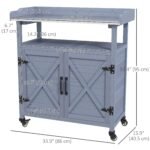 Potting Bench with Storage Info: Dimensions: 33.75″ W x 16″ D x 37.5″ H (86 x 40.5 x 95 cm). Maximum Load: 110 lbs. (50 kg) (Tabletop), 55 lbs. (25 kg) (Storage Layer), 44 lbs. (20 kg) (Cabinet). Assembly required.