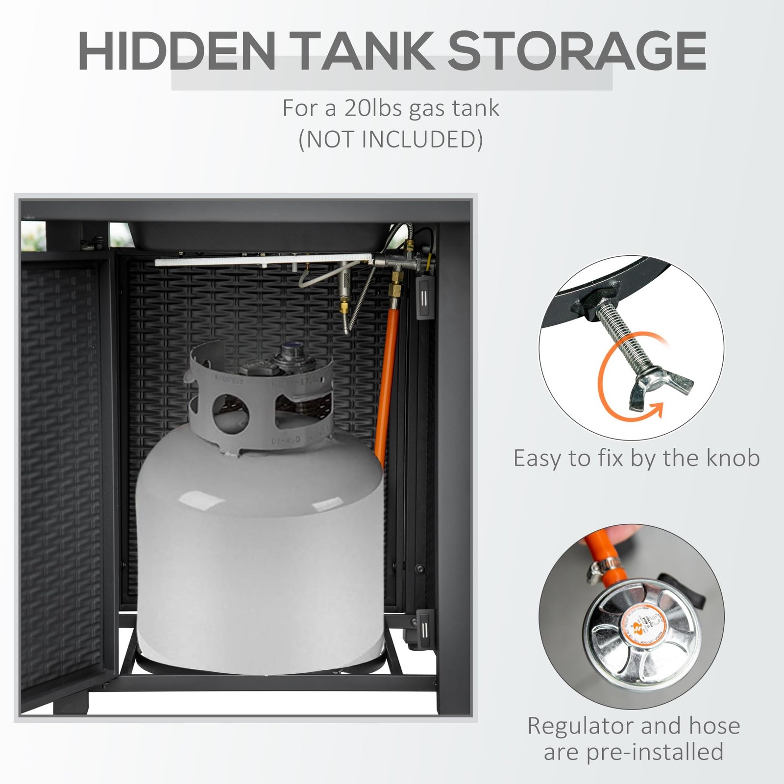 Outdoor Gas Fire Pit Table Information: Overall Dimension: 28″ L x 28″ W x 24.8″ H (71 x 71 x 63 cm). Regulator and hose are pre-installed for your convenience. Need a 20 lbs. (9 kg) propane tank but NOT included.