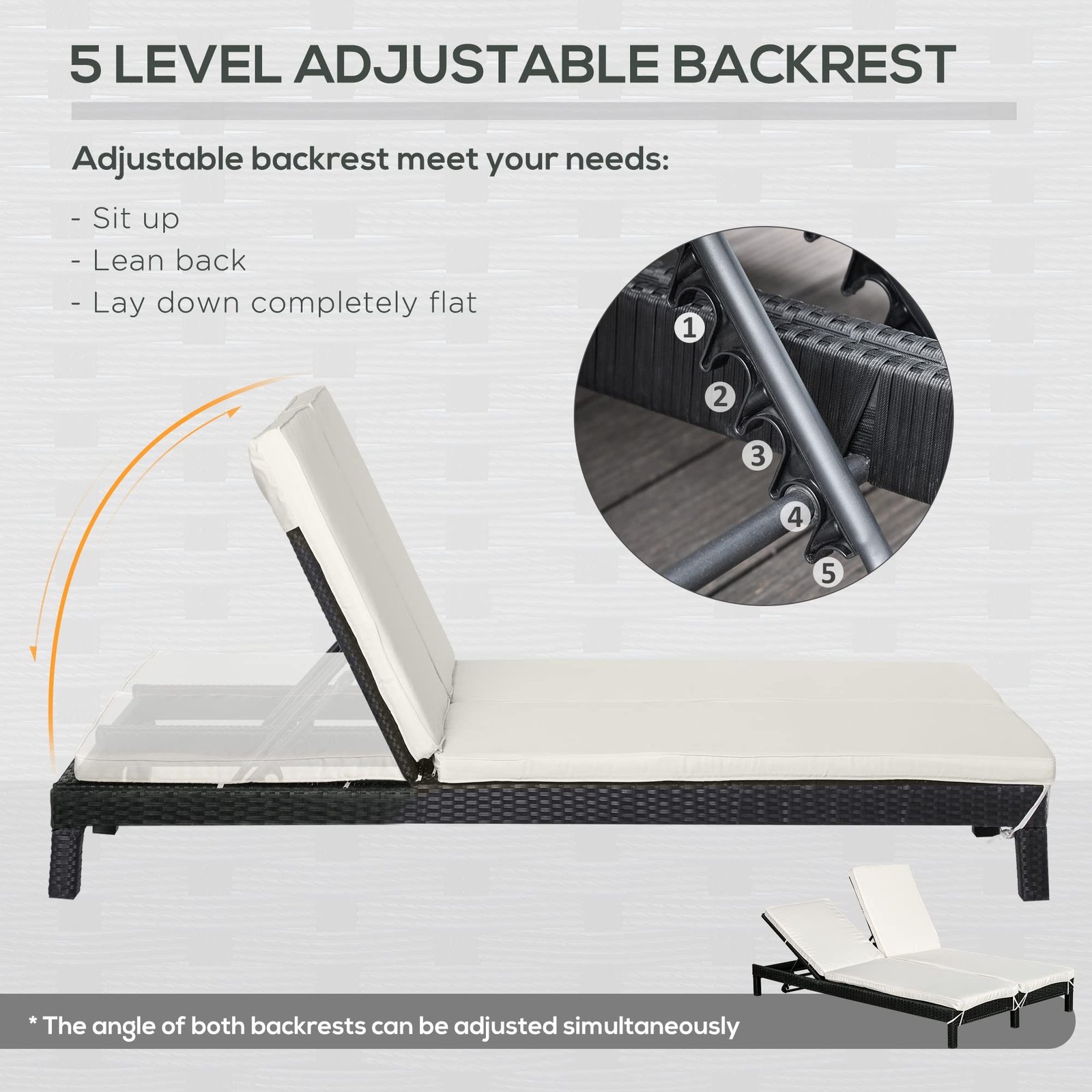 Reclining Backrest: An adjustable backrest allows you to choose from 5 different positions so you can sit up, lean back, or lay down completely flat.