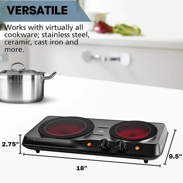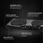 DescriptionHave a hot, freshly-cooked homemade meal anytime, anywhere! Discover how fast it is to boil a full pot of stew with our OVENTE Infrared Double Plate Burner. An alternative to traditional stovetop that produces top-of-the-line performance without any cookware restrictions. It features a thermostat control knob to heat food and provide even cooking, plus it keeps the heat constant according to your desired temperature. Equipped with 1700 watts of power, space-saver and lightweight which means it?s easy to store, whether in a cabinet or a suitcase. Its new and modern design flatters any living space and looks stylish enough to have around while entertaining guests for any house party or occasion. Works great as a gift for college students in dorms, young adults living on their own, people with small spaces or caravans and you can take it with you when you travel for outings, camping trips or boat rides. Great for everyday use or as an extra cooking appliance for people who need a backup stove at a reasonable price. It?s flameless with non-slip rubber feet that keep it steady on a flat surface which makes it convenient, safe and easy to operate.