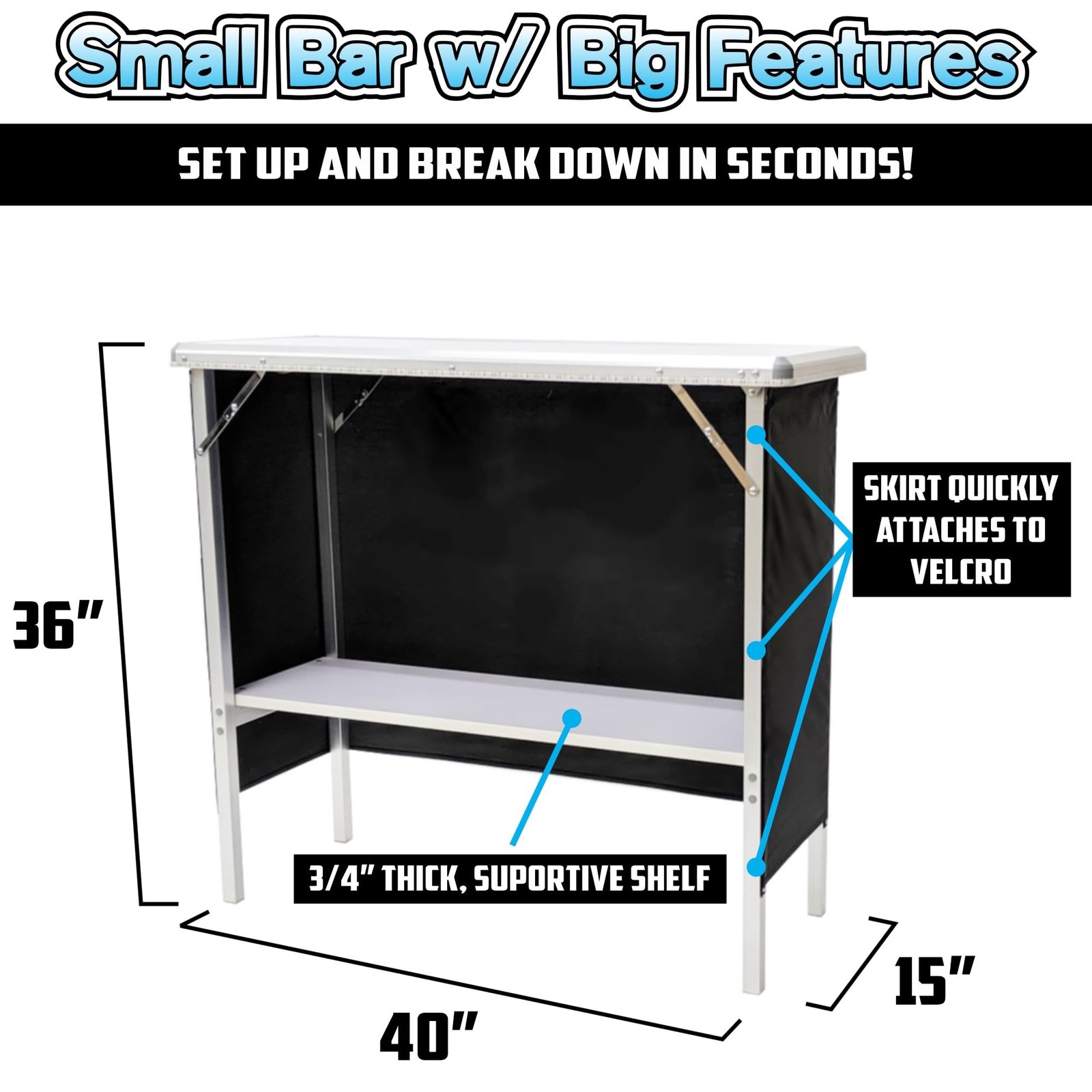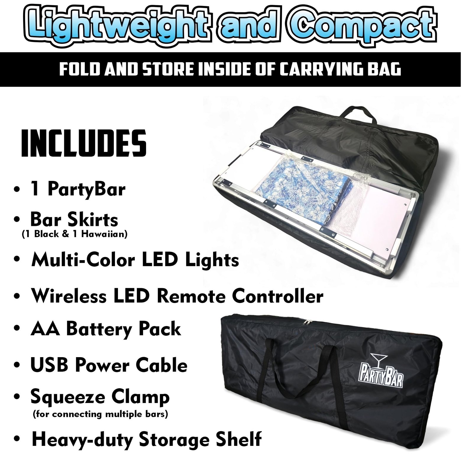 FEATURES: Lightweight. Affordable. Portable. Folding. Aluminum framing and legs provide rigidity without adding weight. Easily set up and break down in seconds. Heavy-duty, thick storage shelf easily locks onto each leg brace for extra storage, weight, and stability. 1 Black & 1 Hawaiian bar skirt included with each bar. Easily attach the skirt around the front and sides using the pre-installed hook & loop (Velcro) fastener. Nylon carrying case makes transportation and storage a breeze.