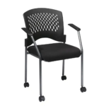 Stunningly simple, yet surprisingly smart, this Pro-Line Ventilated Back Rolling Visitors Chair is a conpendium of minimalist & contemporary design. The truncated style of the armrest provides for an ultra modern uber haute aesthetic. Conveniently stackable, this unique seating option features a ventilated wrap around back, a titanium-finish frame for a sleek “moderne” look, durable dual-wheel carpet casters for effortless mobility, and dense foam cushion for optimal comfort. Add to cart now and start enjoying this affordable chair for years to come.