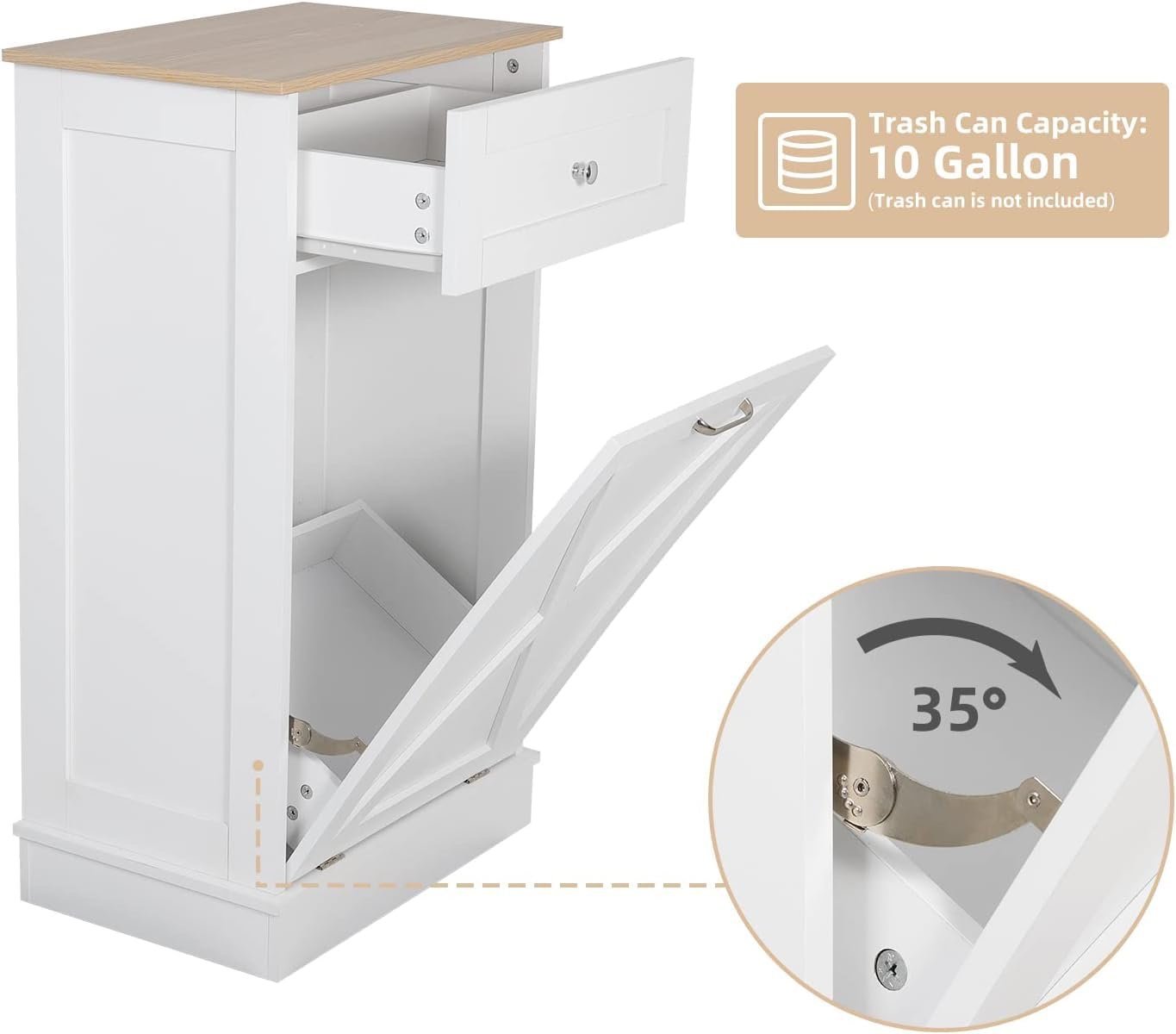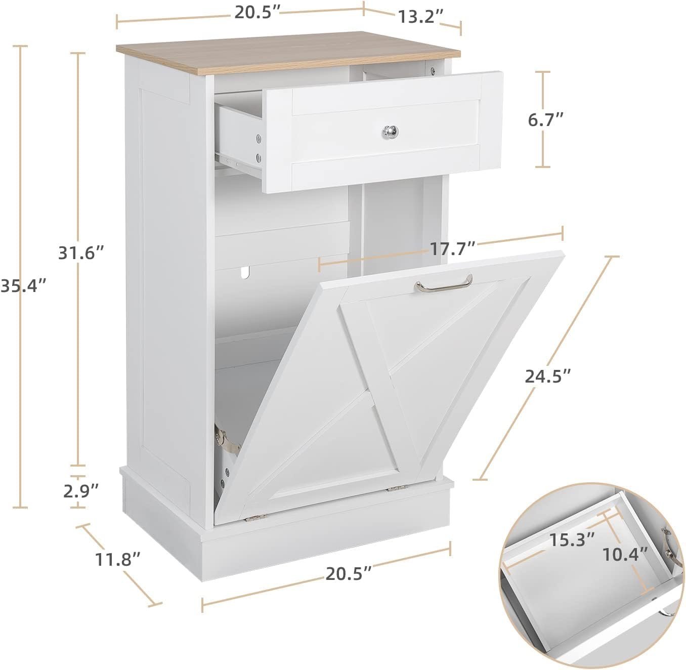 Sturdy Construction — Puluomis Tilt Out Trash Cabinet is made of MDF wood. The size is 20.5″L x 13.2″W x 35.5″H, and the maximum can hold a trash can under 10 gallons (Note: the trash can is not included).