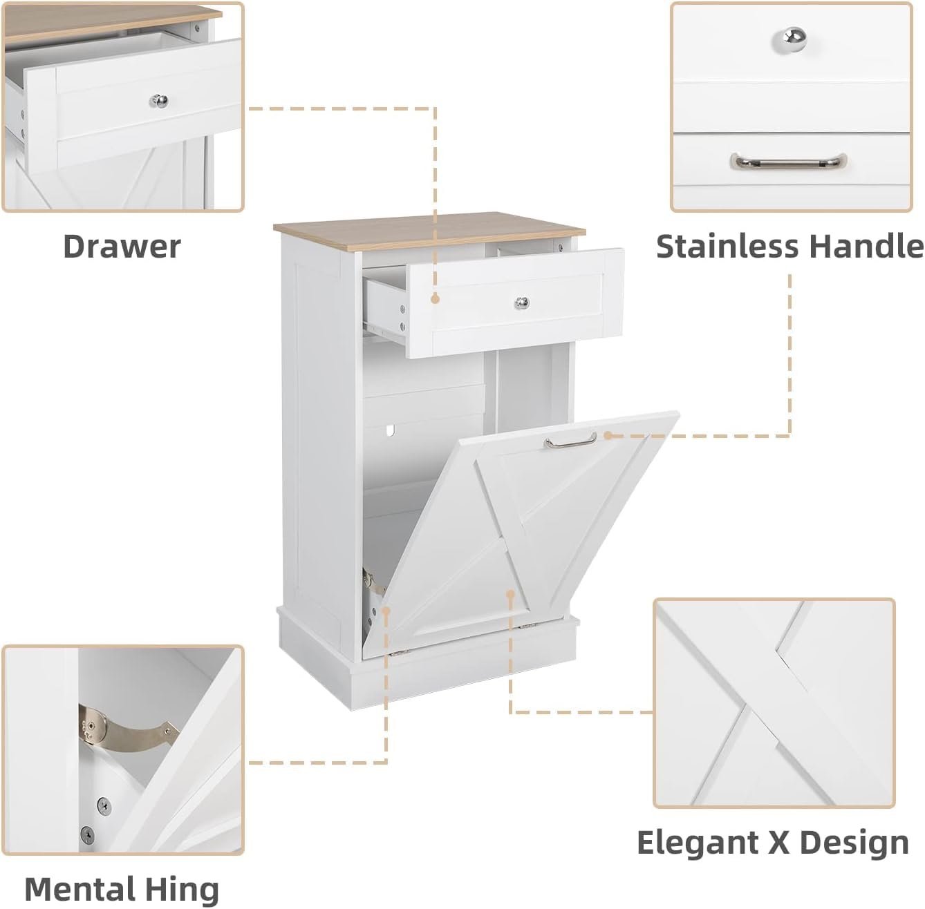 Multipurpose use — The Recycling Tilt Out Trash Cabinet is not only a practical kitchen trash can but it can also be used as a laundry basket or recycling bin, as well as a pet food bin or a garden potting table. Extra drawer for trash bags or other small items.