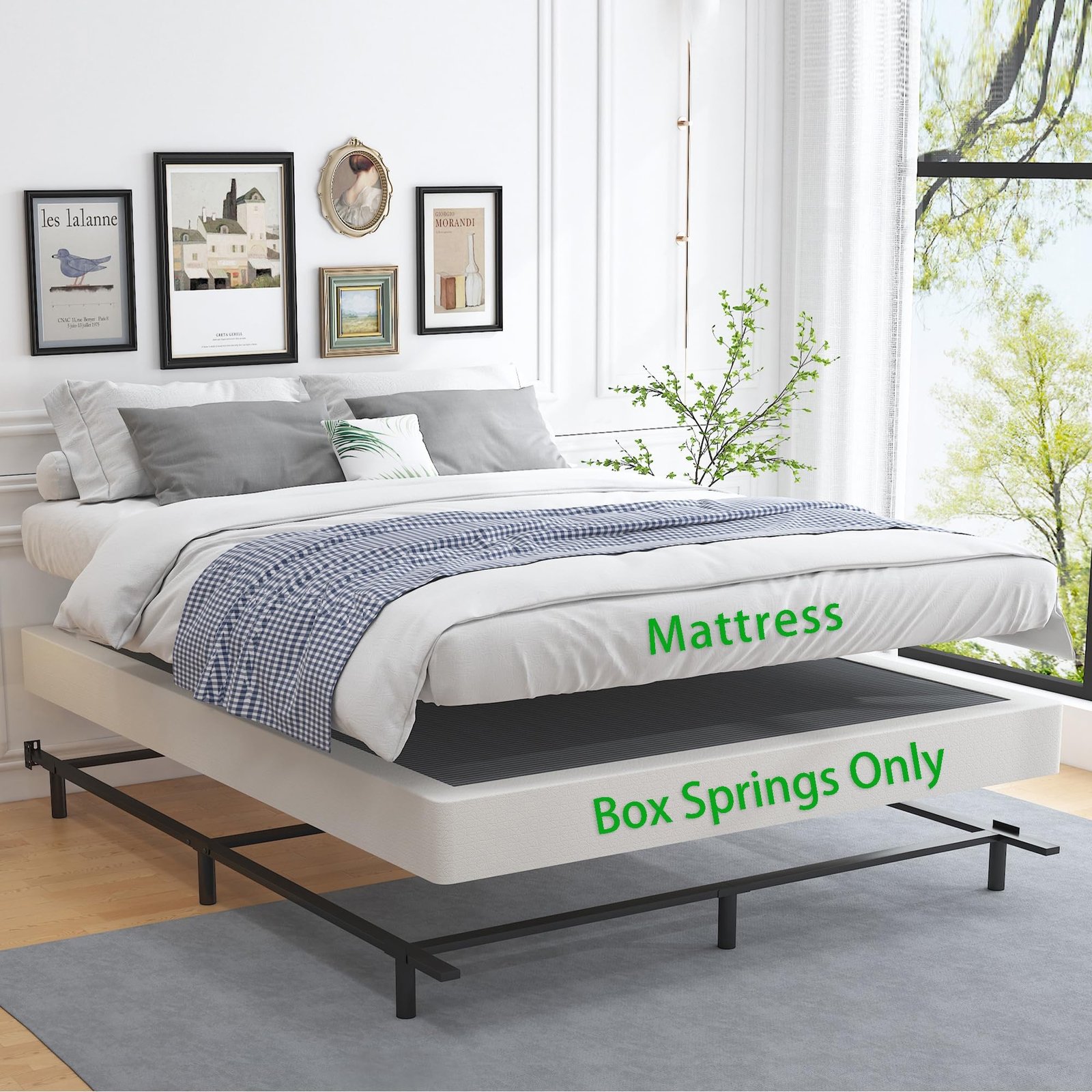 Box Springs Sturdy Construction: Heavy duty metal slats and durable reinforced steel construction that resists wear and tear. Crafted to evenly distribute weight and minimize sagging, it ensures your mattress remains in optimal condition. 3000lbs max weight capacity